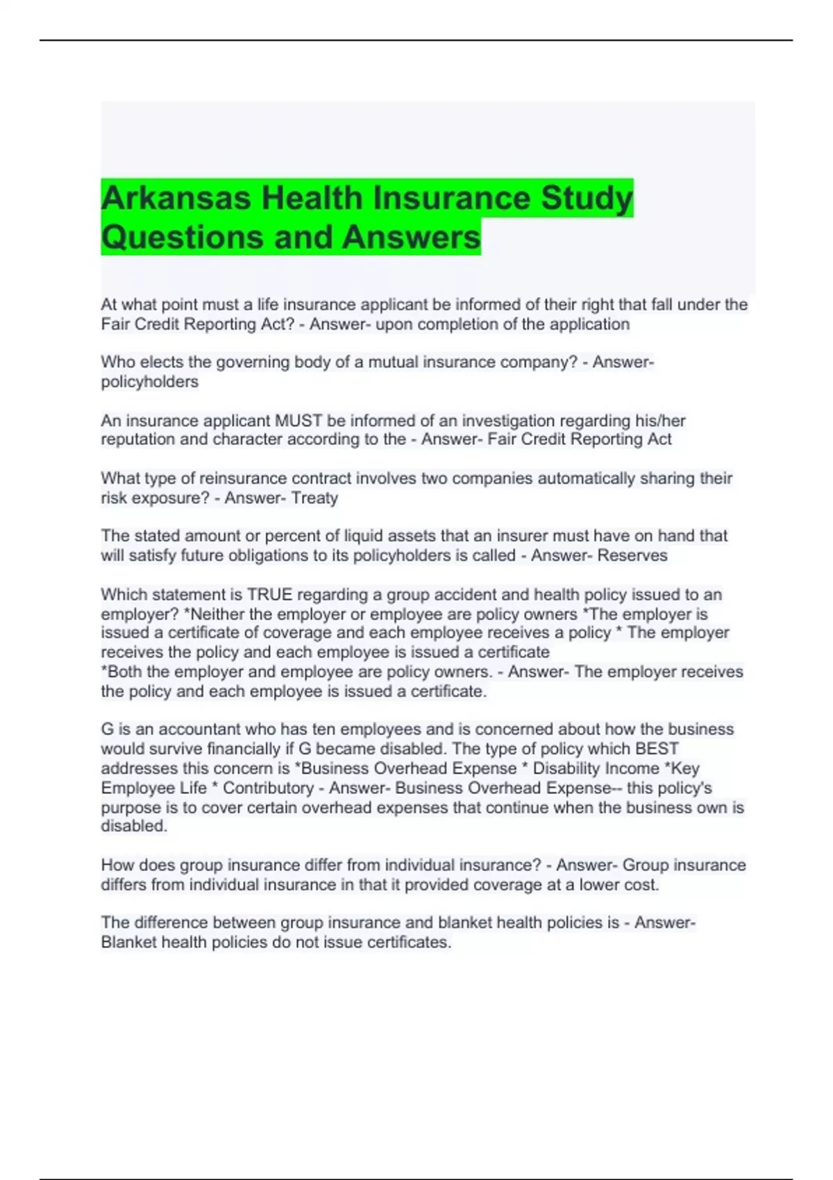 Arkansas Health Insurance Study Questions and Answers 2024 - Graded A