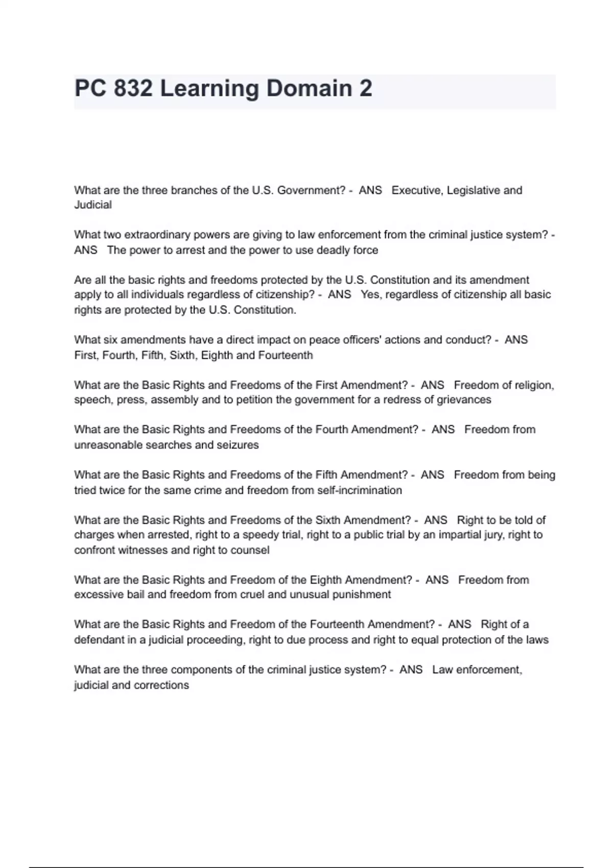 PC 832 Learning Domain 2 Exam Questions And Answers What are the three branches of the U.S. Government? - ANS Executive, Legislative and Judicial What two extraordinary powers are giving to law enforcement from the criminal justice system? - ANS The power to arrest and the power to use deadly force Are all the basic rights and freedoms protected by the U.S. Constitution and its amendment apply to all individuals regardless of citizenship? - ANS Yes, regardless of citizenship all basic rights are protected by the U.S. Constitution. What six amendments have a direct impact on peace officers' actions and conduct? - ANS First, Fourth, Fifth, Sixth, Eighth and Fourteenth What are the Basic Rights and Freedoms of the First Amendment? - ANS Freedom of religion, speech, press, assembly and to petition the government for a redress of grievances What are the Basic Rights and Freedoms of the Fourth Amendment? - ANS Freedom from unreasonable searches and seizures What are the Basic Rights and Freedoms of the Fifth Amendment? - ANS Freedom from being tried twice for the same crime and freedom from self-incrimination What are the Basic Rights and Freedoms of the Sixth Amendment? - ANS Right to be told of charges when arrested, right to a speedy trial, right to a public trial by an impartial jury, right to confront witnesses and right to counsel What are the Basic Rights and Freedom of the Eighth Am