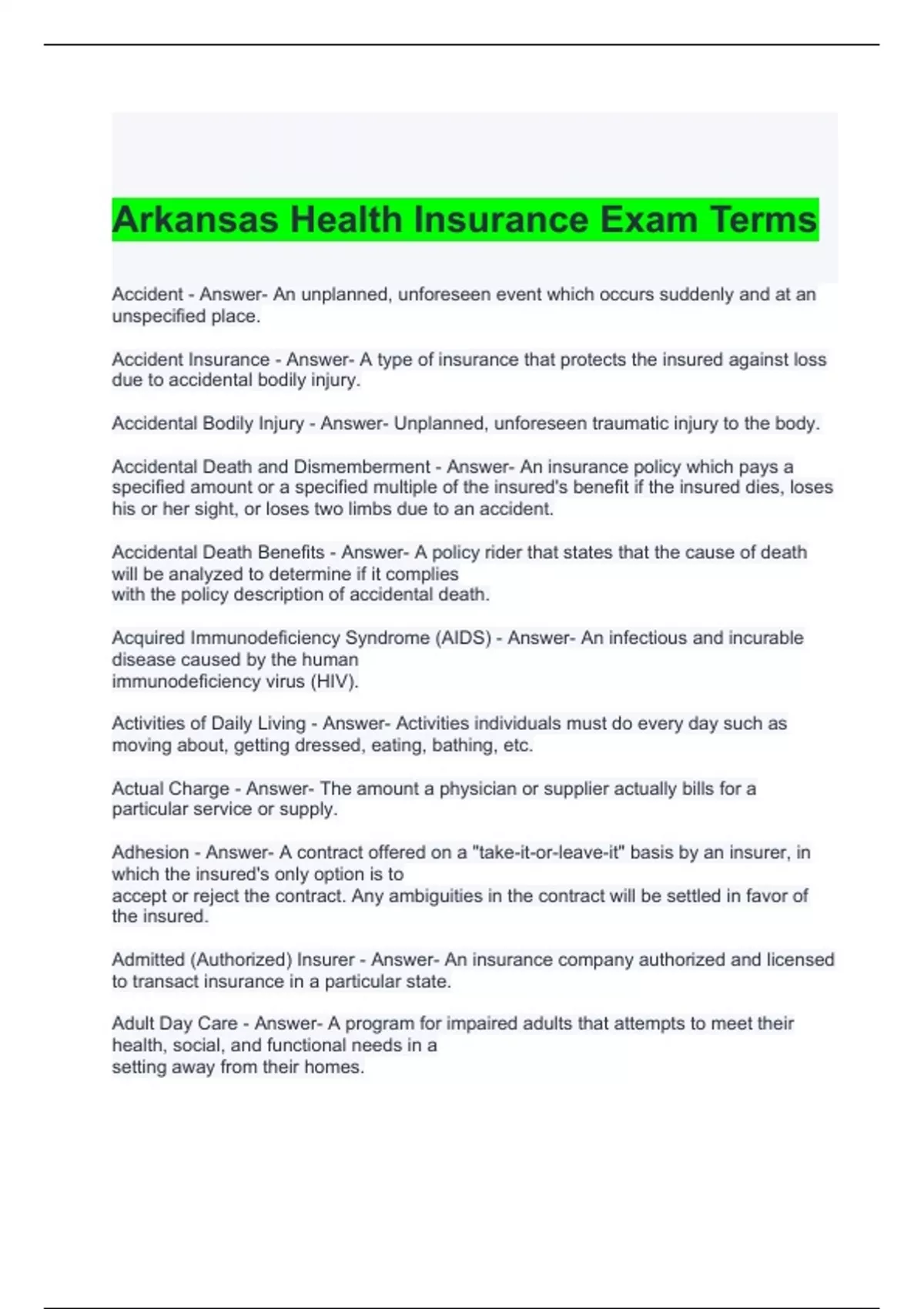 Arkansas Health Insurance Exam Terms with correct Answers