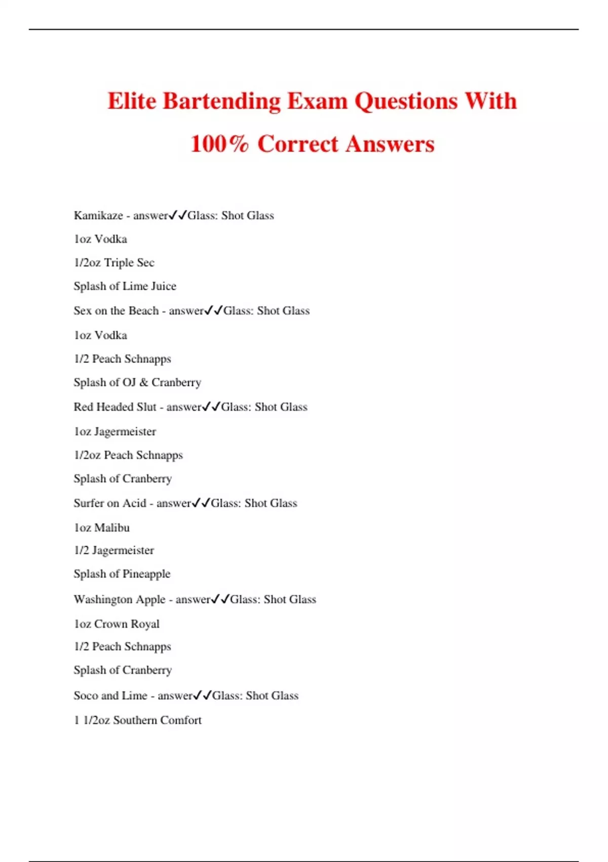 Elite Bartending Exam Questions With 100% Correct Answers Kamikaze - answerGlass: Shot Glass 1oz Vodka 1/2oz Triple Sec Splash of Lime Juice Sex on the Beach - answerGlass: Shot Glass 1oz Vodka 1/2 Peach Schnapps Splash of OJ & Cranberry Red Headed Slut - answerGlass: Shot Glass 1oz Jagermeister 1/2oz Peach Schnapps Splash of Cranberry Surfer on Acid - answerGlass: Shot Glass 1oz Malibu 1/2 Jagermeister Splash of Pineapple Washington Apple - answerGlass: Shot Glass 1oz Crown Royal 1/2 Peach Schnapps Splash of Cranberry Soco and Lime - answerGlass: Shot Glass 1 1/2oz Southern Comfort Splash of Lime Juice Liquid Cocaine - answerGlass: Shot Glass 1/2oz Jagermeister 1/2oz Goldschlager 1/2oz Rumple Minze Lemon Drop - answerGlass: Shot Glass 1 1/2oz Citron Vodka Splash of Sour Garnish: Sugared Lemon Chocolate Cake - answerGlass: Shot Glass or Lowball 1oz Citron Vodka 1/2oz Frangelico Garnish: Sugared Lemon Wedge Irish Breakfast - answerGlass: Shot Glass 1oz Jameson 1/2oz Butterscotch Schnapps Splash of OJ Woo-Woo - answerGlass: Shot Glass 1oz Vodka 1/2oz Peach Schnapps Splash of Cranberry Key Lime Pie - answerGlass: Shot Glass 1 1/2 Vanilla Vodka Splash of Lime Juice Splash of Milk or Half & Half Orgasm - answerGlass: Shot Glass 1/2oz Irish Cream 1/2oz Amaretto 1/2oz Coffee Liqueur Water Moccasin - answerGlass: Shot Glass 1oz Crown Royal 1/2 Peach Schnapps Splash of Sour Mix 3 Wisemen - answerGlass: Shot Glass 1/2oz Jack Daniels 1/2oz Jonnie Walker 1/2 Jim Bean Apple Sauce - answerGlass: Shot Glass 1oz Goldschlager 1/2 Apple Schnapps Splash of Pineapple Royal Flush - answerGlass: Shot Glass 1oz Crown Royal 1/2oz Peach Schnapps Splash of Cranberry Jager Bomb - answerGlass: Shot Glass 1 1/2oz Jagermeister Glass: Highball 1/2 Glass of Redbull Drop Shot in Redbull Cherry Bomb - answerGlass: Shot Glass 1 1/2oz Cherry Vod