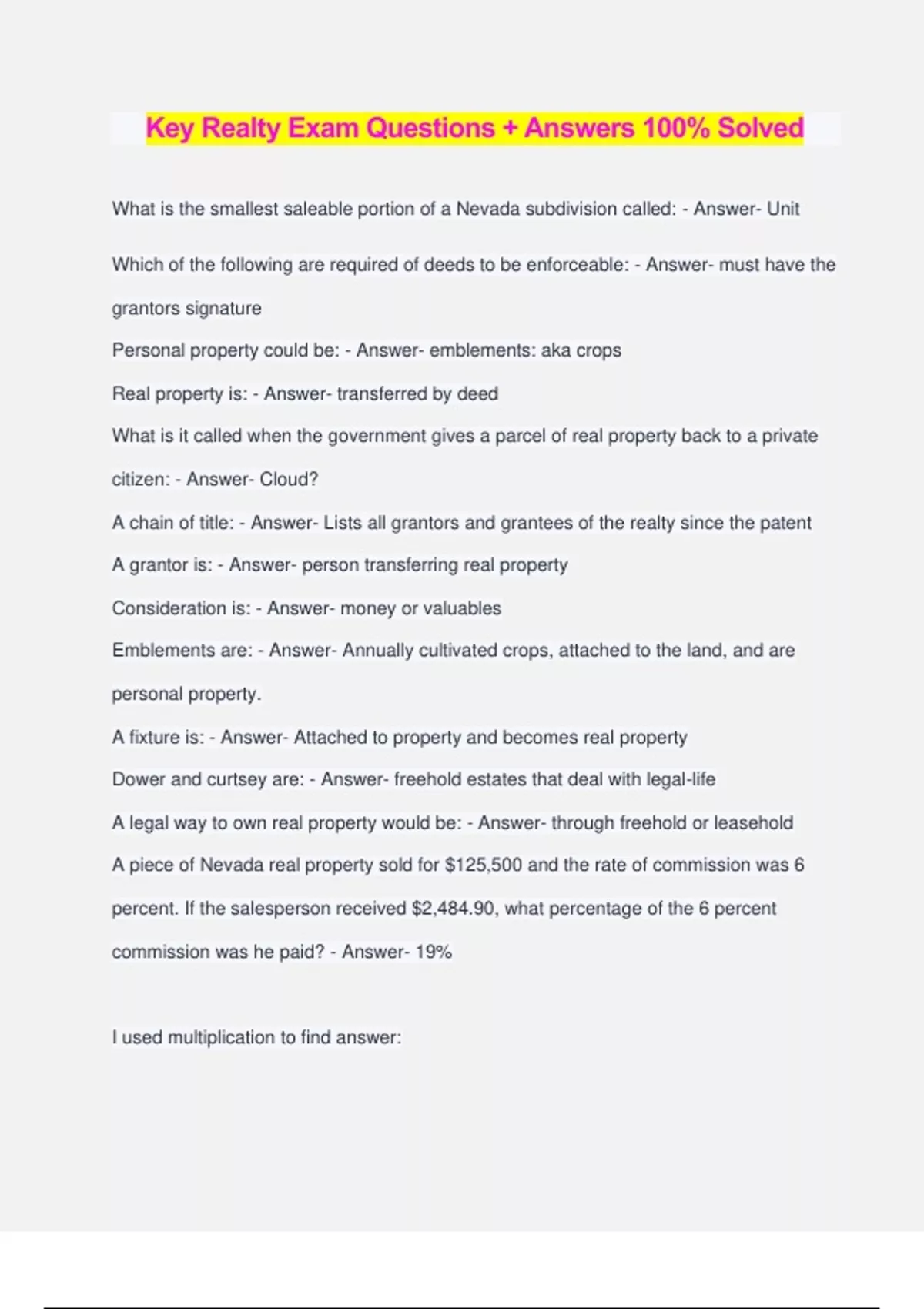 Key Realty Exam Questions + Answers 100% Solved What is the smallest saleable portion of a Nevada subdivision called: - Answer- Unit Which of the following are required of deeds to be enforceable: - Answer- must have the grantors signature Personal property could be: - Answer- emblements: aka crops Real property is: - Answer- transferred by deed What is it called when the government gives a parcel of real property back to a private citizen: - Answer- Cloud? A chain of title: - Answer- Lists all grantors and grantees of the realty since the patent A grantor is: - Answer- person transferring real property Consideration is: - Answer- money or valuables Emblements are: - Answer- Annually cultivated crops, attached to the land, and are personal property. A fixture is: - Answer- Attached to property and becomes real property Dower and curtsey are: - Answer- freehold estates that deal with legal-life A legal way to own real property would be: - Answer- through freehold or leasehold A piece of Nevada real property sold for $125,500 and the rate of commission was 6 percent. If the salesperson received $2,484.90, what percentage of the 6 percent commission was he paid? - Answer- 19% I used multiplication to find answer: Step 1: multiply 125,500 by 6 percent to get totally commission = 7,530 Step 2: We want to know the difference in salesperson receivable and total: 7,530-2484.90= 5,045.1 Step 3: what's the percentage difference? well we know its well under answers b and d so lets narrow down to A & c 19% or 33% Answer =19% What is the Nevada licensed person who signed a duties owed with a client called: - Answer- The following are true about Nevada real estate licensing except: - Answer- The Nevada broker must turn over earnest money to: - Answer- A concealment of material fact is called: - Answer- fraud What is one of the ways to terminate a listing agreement: - Answer- expiration of listing Who retains legal title of real property in an i