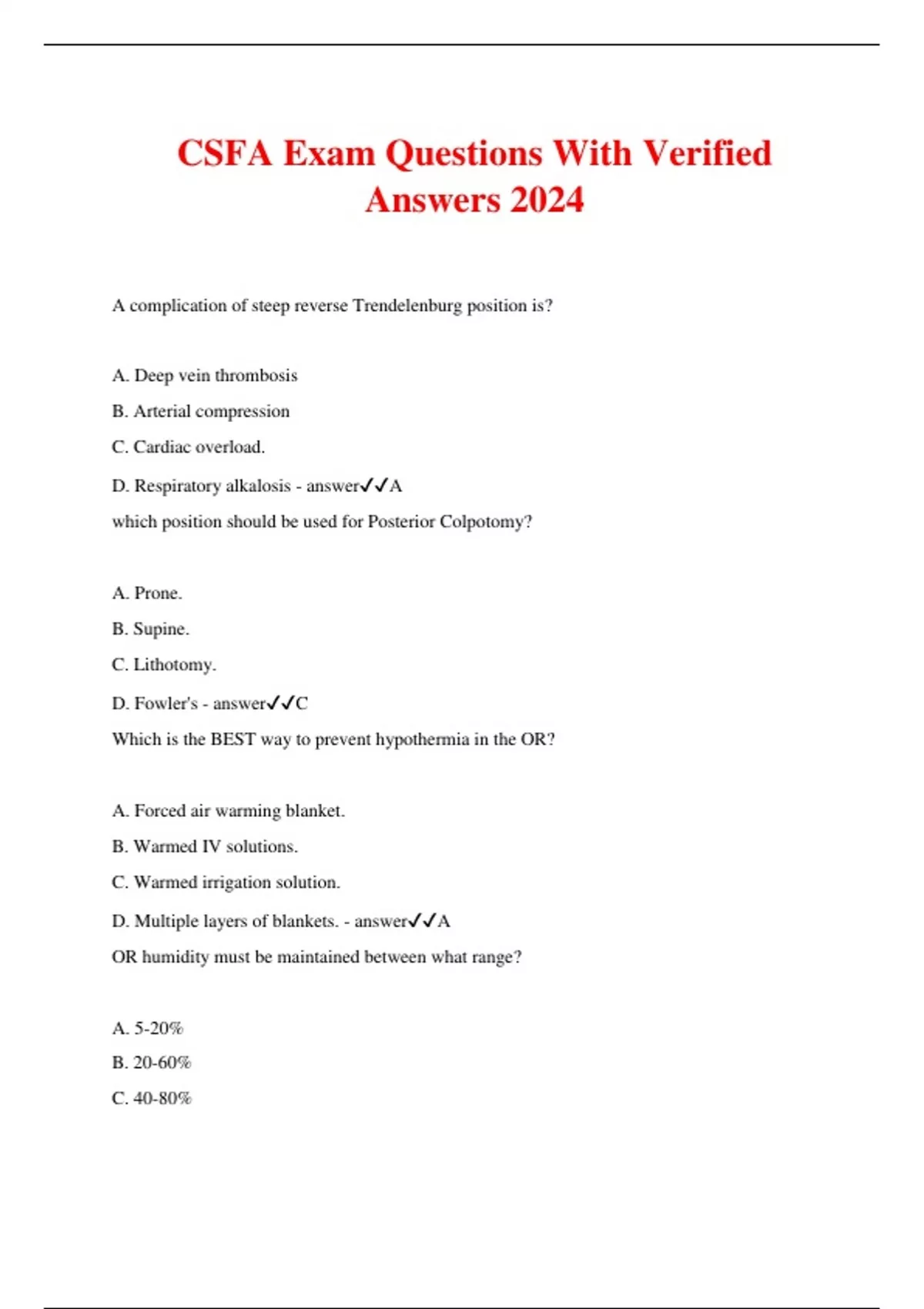 CSFA Exam Questions With Verified Answers 2024 A complication of steep reverse Trendelenburg position is? A. Deep vein thrombosis B. Arterial compression C. Cardiac overload. D. Respiratory alkalosis - answerA which position should be used for Posterior Colpotomy? A. Prone. B. Supine. C. Lithotomy. D. Fowler's - answerC Which is the BEST way to prevent hypothermia in the OR? A. Forced air warming blanket. B. Warmed IV solutions. C. Warmed irrigation solution. D. Multiple layers of blankets. - answerA OR humidity must be maintained between what range? A. 5-20% B. 20-60% C. 40-80% D. 50-90% - answerB This is an important process in which all team members must participate just prior to incision. What is it called? A. Huddle B. Timeout. C. Debriefing D. Consent - answerB Mohs surgery is used to treat what type of cancer? A. Malignant melanoma and basal cell carcinoma. B. Basal cell and squamous cell carcinoma. C. Malignant melanoma and squamous cell carcinoma. D. Basal cell and Merkel cell carcinoma - answerB When reviewing the patients chart scheduled for a mammoplasty, it's noticed that their K+ is 5.4. What is the patient suffering from? A. Hyperkalemia B. Hypercalcemia C. Hypokalemia. D. Hypocalcemia - answerA Which device is the preferred positioning device used during surgical procedures? A. Foam pads. B. Saline bags. C. Gel pads. D. Sheet rolls. - answerC When inserting a Foley catheter into a male patient, the surgical assistant encounters difficulty. What is the NEXT step that the surgical assistant should take? A. Proceed with force until the catheter goes in. B. Stop attempting and notify the surgeon. C. Abort the surgical procedure. D. Obtain a new kit and try again. - answerB What could occur as a result of a tourniquet causing excessive pressure on the nerve? A. Paralysis B. Ischemia C. Hematoma D. Necrosis - answerA What position is used for a LAVH? A. Reverse Trendelenburg B. Supine C. Lateral Recumbent D. Lithotomy - answerD What type of positioning injury occurs when underlying tissue is stationary while the skeletal structure moves? A. Friction injury B. Pressure injury C. Shear injury D. negativity injury - answerC What patient positioning would be MOST likely to cause an obturator nerve injury? A. Lateral B. Prone C. Lithotomy D. Semi- Fowler's - answerC When the surgeon incises tissue, the surgical assistant usually provides a clear field by? A. Light Adjustment B. Clamping C. Retraction D. Cauterizing - answerC Which procedure is known as a Kelley procedure? A. Anterior colporrhaphy B. Cervical conization C. Bartholin cyst marsupialization D. Vulvectomy - answerA What type of shunt is used during a Carotid Endarterectomy? A. Javid B. Fogarty C. Swan-Ganz D. Rummel - answerA Which organ has a fragile collagen-rich capsule and must be handled carefully? A. Kidney B. Gallbladder C. Liver D. Spleen - answerD Which procedure would require a pne