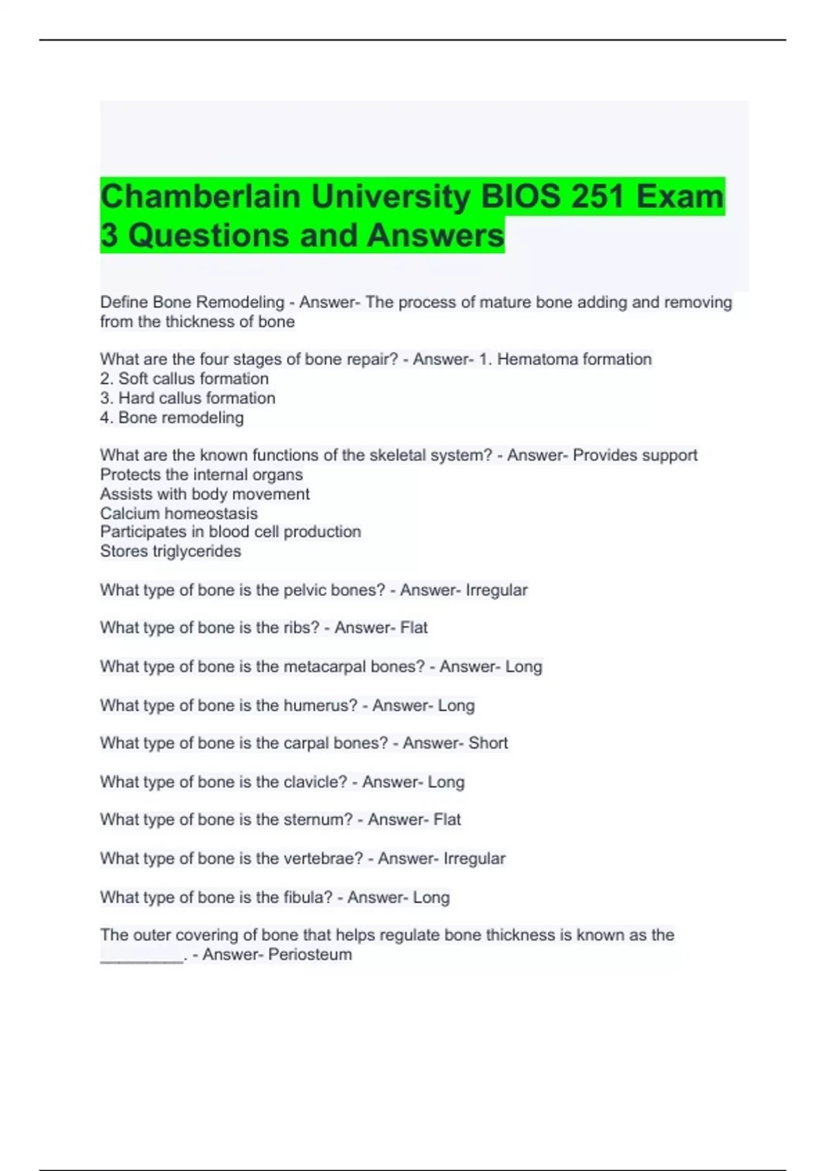 Chamberlain University BIOS 251 Exam 3 Questions and Answers- Graded A