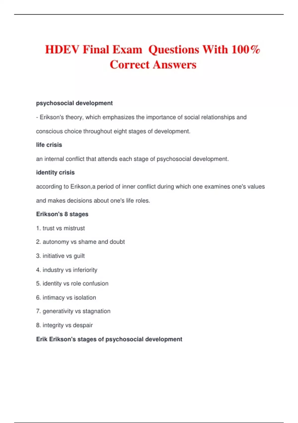 HDEV Final Exam Questions With 100% Correct Answers psychosocial development - Erikson's theory, which emphasizes the importance of social relationships and conscious choice throughout eight stages of development. life crisis an internal conflict that attends each stage of psychosocial development. identity crisis according to Erikson,a period of inner conflict during which one examines one's values and makes decisions about one's life roles. Erikson's 8 stages 1. trust vs mistrust 2. autonomy vs shame and doubt 3. initiative vs guilt 4. industry vs inferiority 5. identity vs role confusion 6. intimacy vs isolation 7. generativity vs stagnation 8. integrity vs despair Erik Erikson's stages of psychosocial development - stage theory of psychosocial development, lifespan consists of eight dilemmas that must be solved correctly in order to solve the next dilemma -each stage builds on tasks of the previous stage, successful mastery leads to a sense of self Erikson's theory focuses on the development of emotional life and psychological traits, he focused on social relationships hence psychosocial development - Erikson places great emphasis on the ego, or the sense of self. - Erikson has stages to include the concerns of adulthood and labeled them after the life crisis that people might encounter during that stage. - Erikson proposed that social relationships and physical maturation give each stage its character. Trust vs. Mistrust - (birth-12 months of age) -infants must learn that adults can be trusted and occurs when adults meet a child’s basic needs for survival. - Infants are dependent upon their caregivers, so caregivers who are responsive and sensitive to their infant’s needs help their baby to develop a sense of trust; their baby will see the world as a safe, predictable place. - Unresponsive caregivers who do not meet their baby’s needs can engender feelings of anxiety, fear, and mistrust; their baby may see the world as unpredictable. - If infants are treated cruelly or their needs are not met appropriately, they will likely grow up with a sense of mistrust for people in the world. Autonomy vs. Shame and Doubt - (ages 1–3 years) - As tots begin to explore their world, they learn that they can control their actions and act on their environment to get results. - toddlers learn to exercise will and to do things independently - This is the “me do it” stage. For example, - we might observe a budding sense of autonomy in a 2-year-old child who wants to choose her clothes and dress herself. Although her outfits might not be appropriate for the situation, her input in such basic decisions has an effect on her sense of independence. - If denied the opportunity to act on her environment, she may begin to doubt her abilities, which could lead to low self-esteem and feelings of shame. Initiative vs. Guilt (age 3-6 years) -Ability to carry out a plan - capable of initiating activities and asserting control over their world through social interactions and play. - preschool children must resolve the task of i_________By learning to plan and achieve goals while interacting with others, preschool children can master this task. Initiative: a sense of ambition and responsibility, occurs when parents allow a child to explore within limits and then support the child’s choice. These children will develop self-confidence and feel a sense of purpose. - Those who are unsuccessful at this stage—with their initiative misfiring or stifled by over-controlling parents—may develop feelings of guilt. industry vs inferiority stage (6 to 12 age) characterized by a focus on efforts to attain competence in meeting the challenges presented by parents, peers, school, and the other complexities of the modern world - Children begin to compare themselves with their peers to see how they measure up. - They either develop a sense of pride and accomplishment in their schoolwork, sports, social activities, and family life, or they feel inferior and inadequate because they feel that they don't measure up. - If children do not learn to get along with others or have negative experiences at home or with peers, an inferiority complex might develop into adolescence and adulthood. identity vs. role confusion (ages 12-18), -Resolved in adolescence -Ability to form a stable identity - stage during which teenagers and young adults search for and become their true selves - During this stage, adolescents attempt to determine whom they are in the present while also imagining possible futures for themselves. - an adolescent's main task is developing a sense of self and attempt to determine whom they are in the present while also imagining possible futures for themselves. - Adolescents struggle with questions such as "Who am I?" and "What do I want to do with my life?" Along the way, most adolescents try on many different selves to see which ones fit; they explore various roles and ideas, set goals, and attempt to discover their "adult" selves. - Adolescents who are successful at this stage have a strong sense of identity and are able to remain true to their beliefs and values in the face of problems and other people's perspectives. - When adolescents are apathetic, do not make a conscious search for identity, or are pressured to conform to their parents' ideas for the future, they may develop a weak sense of self and experience role confusion. They will be unsure of their identity and confused about the future. - Teens who struggle to adopt a positive role will likely struggle to "find" themselves as adults. Intimacy vs. Isolation (20s through early 40s) - individuals form deeply personal relationships, m