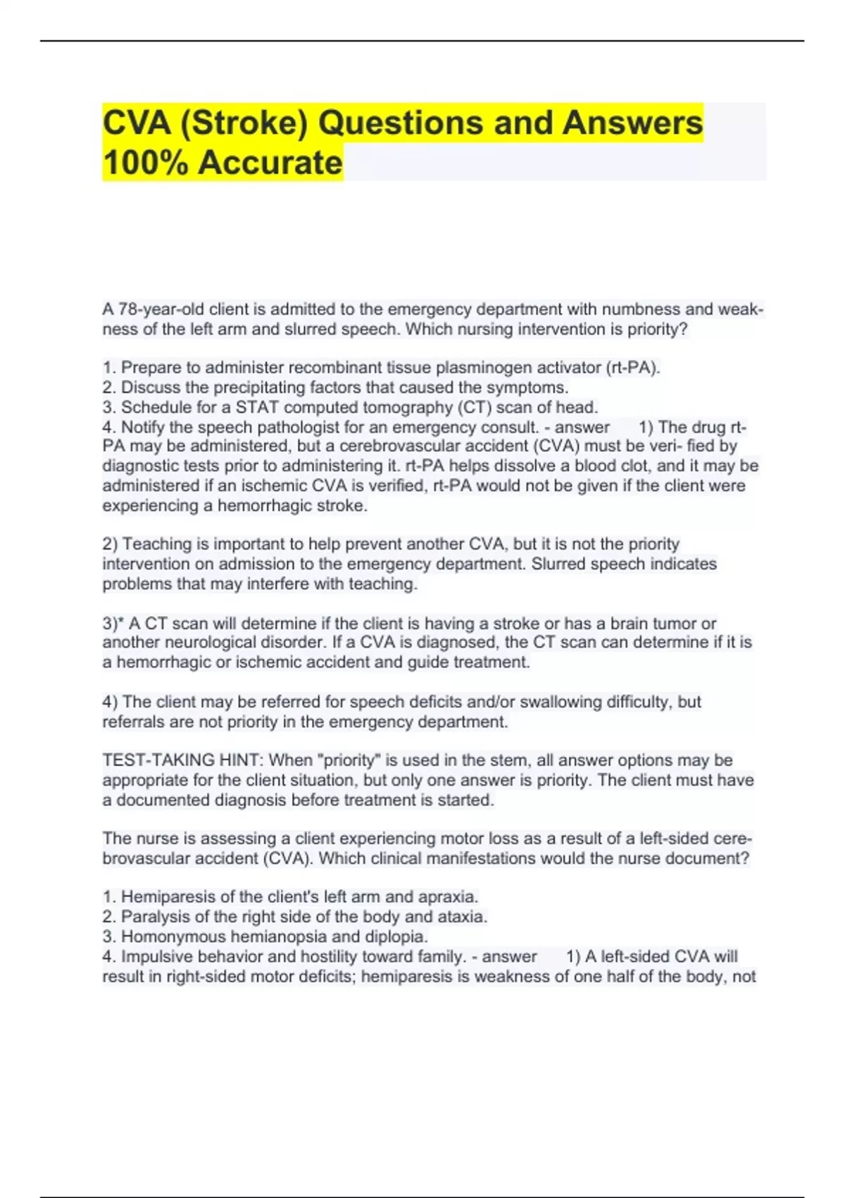 CVA (Stroke) Questions and Answers 100% Accurate A 78-year-old client is admitted to the emergency department with numbness and weak- ness of the left arm and slurred speech. Which nursing intervention is priority? 1. Prepare to administer recombinant tissue plasminogen activator (rt-PA). 2. Discuss the precipitating factors that caused the symptoms. 3. Schedule for a STAT computed tomography (CT) scan of head. 4. Notify the speech pathologist for an emergency consult. 1) The drug rt-PA may be administered, but a cerebrovascular accident (CVA) must be veri- fied by diagnostic tests prior to administering it. rt-PA helps dissolve a blood clot, and it may be administered if an ischemic CVA is verified, rt-PA would not be given if the client were experiencing a hemorrhagic stroke. 2) Teaching is important to help prevent another CVA, but it is not the priority intervention on admission to the emergency department. Slurred speech indicates problems that may interfere with teaching. 3)* A CT scan will determine if the client is having a stroke or has a brain tumor or another neurological disorder. If a CVA is diagnosed, the CT scan can determine if it is a hemorrhagic or ischemic accident and guide treatment. 4) The client may be referred for speech deficits and/or swallowing difficulty, but referrals are not priority in the emergency department. TEST-TAKING HINT: When "priority" is used in the stem, all answer options may be appropriate for the client situation, but only one answer is priority. The client must have a documented diagnosis before treatment is started. The nurse is assessing a client experiencing motor loss as a result of a left-sided cere- brovascular accident (CVA). Which clinical manifestations would the nurse document? 1. Hemiparesis of the client's left arm and apraxia. 2. Paralysis of the right side of the body and ataxia. 3. Homonymous hemianopsia and diplopia. 4. Impulsive behavior and hostility toward family. 1) A left-sided CVA will result in right-sided motor deficits; hemiparesis is weakness of one half of the body, not just the upper extremity. Apraxia, the inability to perform a previously learned task, is a communication loss, not a motor loss. 2)*The most common motor dysfunction of a CVA is paralysis of one side of the body, hemiplegia; in this case with a left-sided CVA, the paralysis would affect the right side. Ataxia is an impaired ability to coordi- nate movement. 3) Homonymous hemianopsia (loss of half of the visual field of each eye) and diplopia (double vision) are visual field deficits that a client with a CVA may experience, but they are not motor losses. 4) Personality disorders occur in clients with a right-sided CVA and are cognitive deficits; hostility is an emotional deficit. TEST-TAKING HINT: Be sure to always notice adjectives describing something. In this case, "left-sided" describes the type of CVA. Also be sure to identify exactly what the question is asking—in this case, about "motor loss," which will help rule out many of the possible answers. Which client would the nurse identify as being most at risk for experiencing a CVA? 1. A 55-year-old African American male. 2. An 84-year-old Japanese female. 3. A 67-year-old Caucasian male. 4. A 39-year-old pregnant female. 1)* African Americans have twice the rate of CVAs as Caucasians and men have a higher incidence than women; African Americans suffer more extensive damage from a CVA than do people of other cultural groups. 2) Females are less likely to have a CVA than males, but advanced age does increase the risk for CVA. The Oriental population has a lower risk, possibly as a result of their relatively high intake of omega-3 fatty acids, antioxidants found in fish. 3) Caucasians have a lower risk of CVA than do African Americans, Hispanics, and Native Pacific Islanders. 4) Pregnancy is a minimal risk for having a CVA. TEST-TAKING HINT: Note the age of the client if this information is given, but take this infor- mation in context with the additional informa- tion provided in the question-and-answer possibilities. The 84-year-old may appear to be the best answer but not if the client is a female and Oriental, which rules out this answer for the client most at risk. The client diagnosed with a right-sided cerebrovascular accident is admitted to the reha- bilitation unit. Which interventions should be included in the nursing care plan? Select all that apply. 1. Position the client to prevent shoulder adduction. 2. Turn and reposition the client every shift. 3. Encourage the client to move the affected side. 4. Perform quadriceps exercises three (3) times a day. 5. Instruct the client to hold the fingers in a fist. 1)* Placing a small pillow under the shoulder will prevent the shoulder from adducting toward the chest and developing a contracture. 2) The client should be repositioned at least every two (2) hours to prevent contractures, pneumonia, skin breakdown, and other complications of immobility. 3)* The client should not ignore the paralyzed side, and the nurse must encourage the client to move it as much as possible; a writ- ten schedule may assist the client in exercising. 4) These exercises are recommended, but they must be done at least five (5) times a day for ten (10) minutes to help strengthen the muscles for walking. 5) The fingers are positioned so that they are barely flexed to help prevent contracture of the hand. TEST-TAKING HINT: Be sure to look at the intervals of time for any intervention; note that "every shift" and "three times a day" are not appropriate time intervals for this client. The nurse is planning care for a client experiencing agnosia secondary to a cerebrovas- cular accident. Which collaborative intervention will be included in the plan of care? 1. Observing the client swallowing for possible aspiration. 2. Positioning the client in a semi-Fowler's position when sleeping. 3. Placing a suction set-up at the client's bedside during meals. 4. Referring the client 