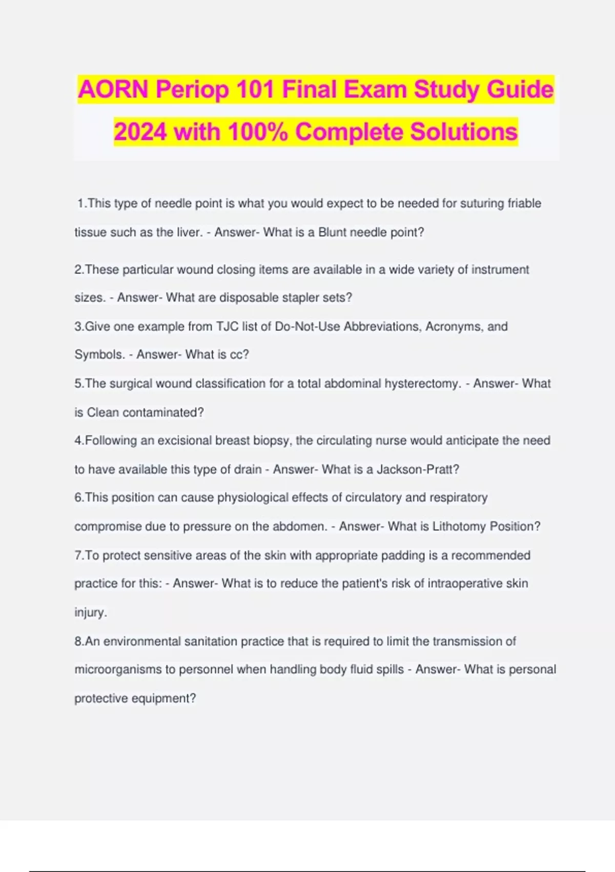 AORN Periop 101 Final Exam Study Guide 2024 with 100% Complete Solutions 1.This type of needle point is what you would expect to be needed for suturing friable tissue such as the liver. - Answer- What is a Blunt needle point? 2.These particular wound closing items are available in a wide variety of instrument sizes. - Answer- What are disposable stapler sets? 3.Give one example from TJC list of Do-Not-Use Abbreviations, Acronyms, and Symbols. - Answer- What is cc? 5.The surgical wound classification for a total abdominal hysterectomy. - Answer- What is Clean contaminated? 4.Following an excisional breast biopsy, the circulating nurse would anticipate the need to have available this type of drain - Answer- What is a Jackson-Pratt? 6.This position can cause physiological effects of circulatory and respiratory compromise due to pressure on the abdomen. - Answer- What is Lithotomy Position? 7.To protect sensitive areas of the skin with appropriate padding is a recommended practice for this: - Answer- What is to reduce the patient's risk of intraoperative skin injury. 8.An environmental sanitation practice that is required to limit the transmission of microorganisms to personnel when handling body fluid spills - Answer- What is personal protective equipment? 9.It is recommended to inspect the active electrode for insulation defects to prevent this from occurring during MIS - Answer- What is capacitive coupling? 10. According to AORN RP for positioning the patient, the perioperative nurse should: What is... a. Use a consistent method of procedure-specific position for each patient b. Rely on the surgeon's and anesthesia provider's assessments to guide positioning c. use additional precautions as appropriate based on unique patient considerations d. Depend on the patient's natural defense mechanisms to indicate the need for positioning alterations - Answer- c. use additional precautions as appropriate based on unique patient considerations 11.The disadvantage of using this type of wound closure is because they often cause more scarring than other skin closure methods. - Answer- What is skin clips? 12.An automatic intraoperative suspension of a do-not-resuscitate decision violates a patient's ethical right to... - Answer- What is Self-determination? 13. This type of human factor error is responsible when a perioperative nurse is trying to attend to several tasks at once - Answer- What is situational-based error? 14.Restricting pathogenic organisms from the patient, environment, equipment, and supplies is the definition of.... - Answer- What is aseptic technique? The most important consideration when selecting these materials is to prevent risk of contaminating patients with endogenous and exogenous microorganisms; and risk of exposing healthcare workers to patient's blood and body fluids - Answer- What are draping materials?
