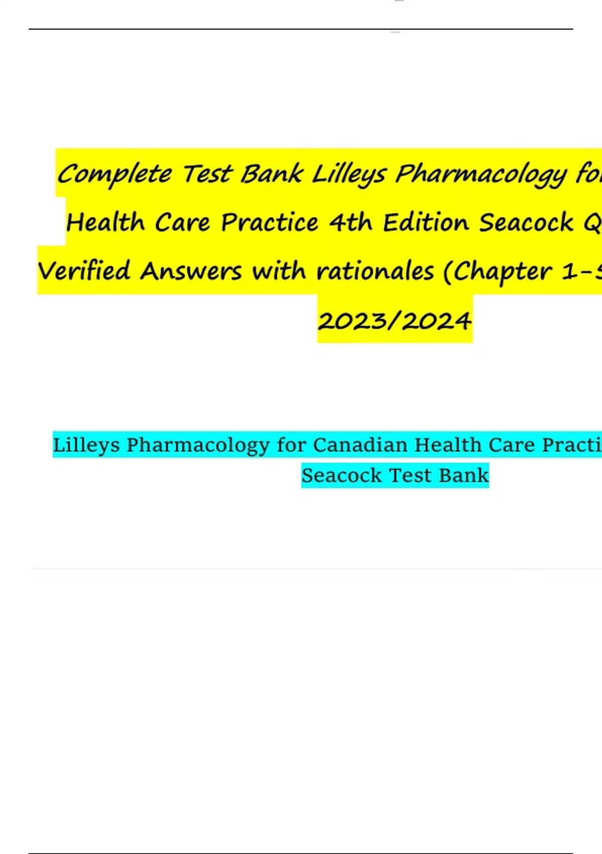 Complete Test Bank Lilleys Pharmacology for Canadian Health Care Practice 4th Edition Seacock Questions & Verified Answers with rationales (Chapter 1-58) Updated 2023/2024