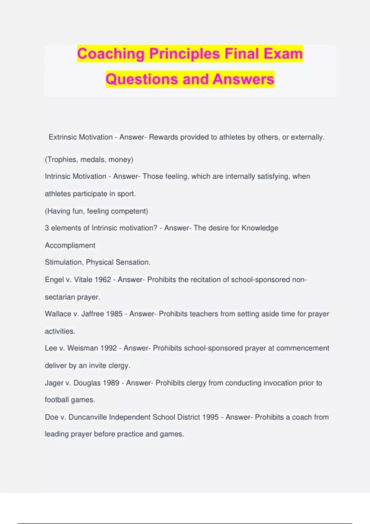 Coaching Principles Final Exam Questions and Answers Extrinsic Motivation - Answer- Rewards provided to athletes by others, or externally. (Trophies, medals, money) Intrinsic Motivation - Answer- Those feeling, which are internally satisfying, when athletes participate in sport. (Having fun, feeling competent) 3 elements of Intrinsic motivation? - Answer- The desire for Knowledge Accomplisment Stimulation, Physical Sensation. Engel v. Vitale 1962 - Answer- Prohibits the recitation of school-sponsored non- sectarian prayer. Wallace v. Jaffree 1985 - Answer- Prohibits teachers from setting aside time for prayer activities. Lee v. Weisman 1992 - Answer- Prohibits school-sponsored prayer at commencement deliver by an invite clergy. Jager v. Douglas 1989 - Answer- Prohibits clergy from conducting invocation prior to football games. Doe v. Duncanville Independent School District 1995 - Answer- Prohibits a coach from leading prayer before practice and games. Borden v. East Brunswick School District 2008 - Answer- Prohibits a coach form endorsing student-led prayer by kneeling and bowing his head with the team. Matthews v. Kountze Independent School District - Answer- Banners that included religious messages were permitted under the constitution. Aerobic (slow glycolysis) - Answer- -With oxygen, for longer duration and less intense physical activity. (long distance running/cycling) --Uses carbohydrates and fat, combined with oxygen, to produce glucose, which is converted to ATP. Anaerobic - Answer- For immediate movement and very intense exercise. (sprinting, jumping, baseball running) Muscular strength - Answer- Maximum amount of force that a muscle can generate in a single effort Muscular Endurance - Answer- The ability of a muscle to repeatedly contract or sustain a continuos contraction involving less than maximum force. Speed - Answer- The ability to move the body or parts of it very quickly. (combination of reaction time and movement time)