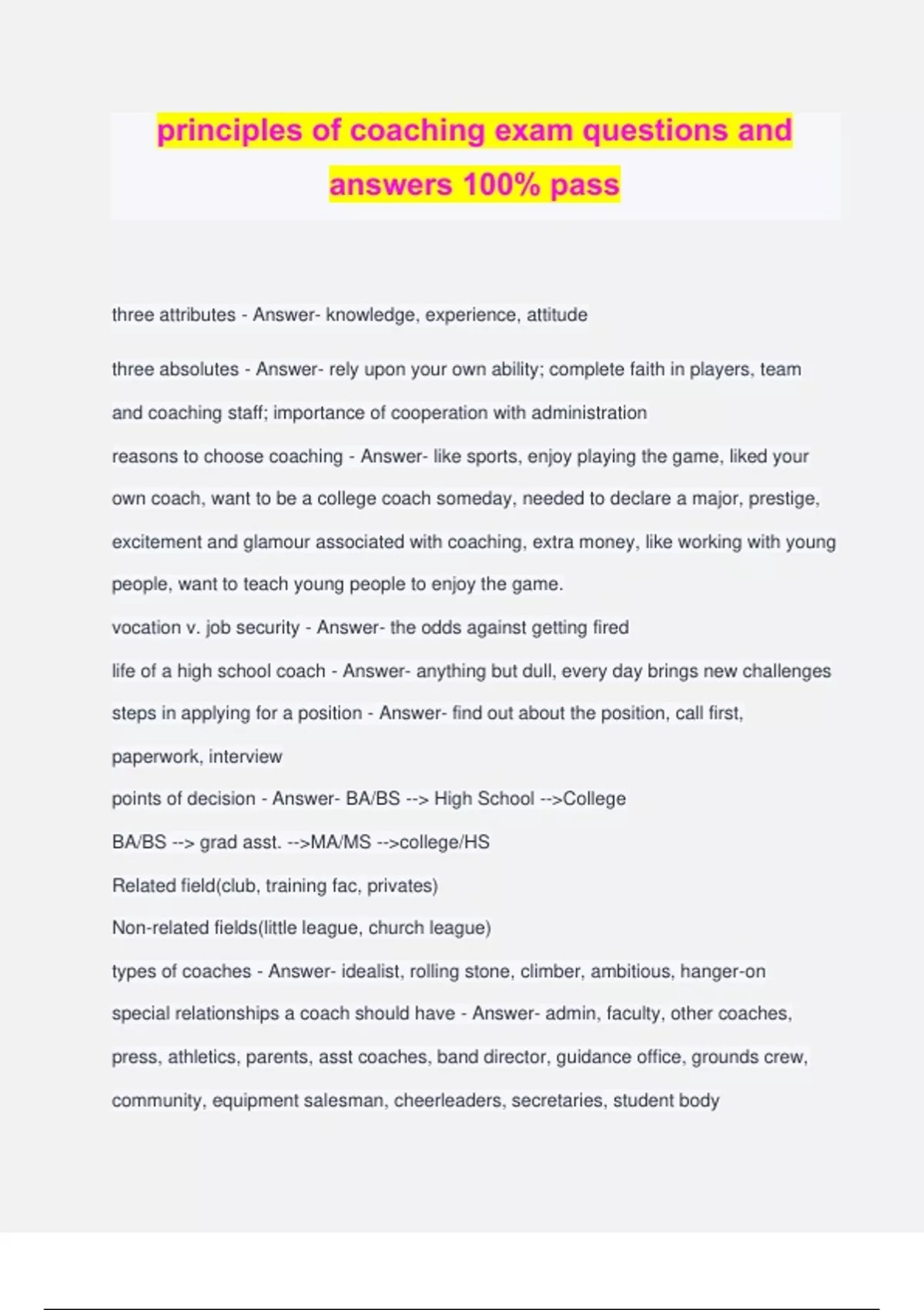 principles of coaching exam questions and answers 100% pass three attributes - Answer- knowledge, experience, attitude three absolutes - Answer- rely upon your own ability; complete faith in players, team and coaching staff; importance of cooperation with administration reasons to choose coaching - Answer- like sports, enjoy playing the game, liked your own coach, want to be a college coach someday, needed to declare a major, prestige, excitement and glamour associated with coaching, extra money, like working with young people, want to teach young people to enjoy the game. vocation v. job security - Answer- the odds against getting fired life of a high school coach - Answer- anything but dull, every day brings new challenges steps in applying for a position - Answer- find out about the position, call first, paperwork, interview points of decision - Answer- BA/BS --> High School -->College BA/BS --> grad asst. -->MA/MS -->college/HS Related field(club, training fac, privates) Non-related fields(little league, church league) types of coaches - Answer- idealist, rolling stone, climber, ambitious, hanger-on special relationships a coach should have - Answer- admin, faculty, other coaches, press, athletics, parents, asst coaches, band director, guidance office, grounds crew, community, equipment salesman, cheerleaders, secretaries, student body roles of a head coach - Answer- teacher, disciplinarian, salesperson, public relations, guidance counselor, diplomat, organizer, example, detective, psychologist, judge and jury, leader, mother/father figure, dictator, politician, actor, fundraiser, field general, equipment manager, trainer, citizen of the school and community three general ways a teacher will affect a student's learning - Answer- image, verbal communication, non-verbal communication qualities of an assistant coach - Answer- loyalty, teacher, enthusiasm, knowledge of the sport, initiative, dependability, philosophy, desire to be a head coach, playing experience, attendance at clinics, rapport with athletes, liason between players and head coach, willingness to work, contributing ideas qualities of a good coach - Answer- transparent realism, reasoning, interest in individuals, respect, ability to motivate, dedication, ability to discipline, identification of goals, ability to recognize talent, enthusiasm, intense desire to win, willingness to work, knowledge of sport, dislike of mediocrity, understanding boys and girls, know what factors make the difference between W/L, ability to develop pride, ability to organize, language, moral standards, dignity, honesty, courage of convictions, ethical standards, good judgment, fairness, imagination, sense of humor understanding boys and girls - Answer- social pressure, uniform wearer, pressure from mom and dad, love of the game, ego involvement, athletic scholarships factors that make the difference between winning and losing - Answer- superior personnel, superior conditioning, fewer mistakes