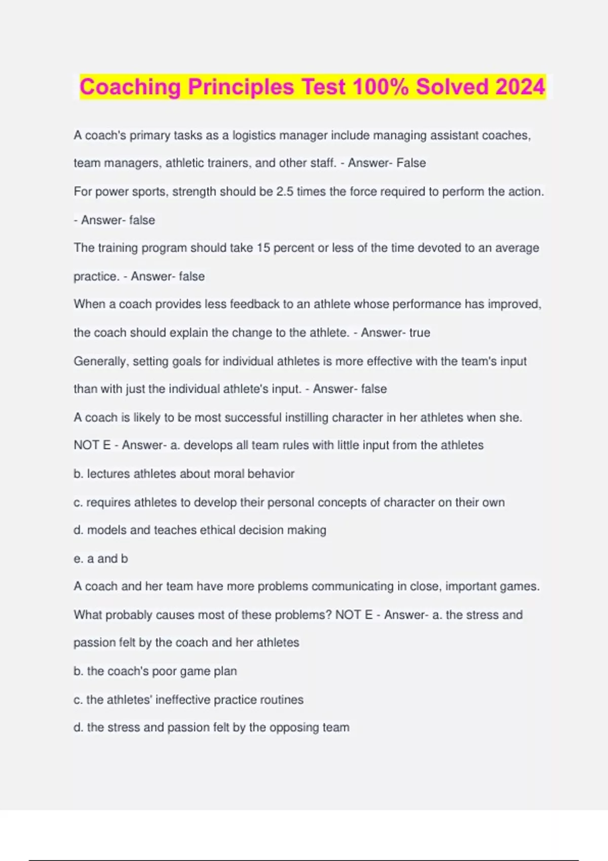Coaching Principles Test 100% Solved 2024 A coach's primary tasks as a logistics manager include managing assistant coaches, team managers, athletic trainers, and other staff. - Answer- False For power sports, strength should be 2.5 times the force required to perform the action. - Answer- false The training program should take 15 percent or less of the time devoted to an average practice. - Answer- false When a coach provides less feedback to an athlete whose performance has improved, the coach should explain the change to the athlete. - Answer- true Generally, setting goals for individual athletes is more effective with the team's input than with just the individual athlete's input. - Answer- false A coach is likely to be most successful instilling character in her athletes when she. NOT E - Answer- a. develops all team rules with little input from the athletes b. lectures athletes about moral behavior c. requires athletes to develop their personal concepts of character on their own d. models and teaches ethical decision making e. a and b A coach and her team have more problems communicating in close, important games. What probably causes most of these problems? NOT E - Answer- a. the stress and passion felt by the coach and her athletes b. the coach's poor game plan c. the athletes' ineffective practice routines d. the stress and passion felt by the opposing team