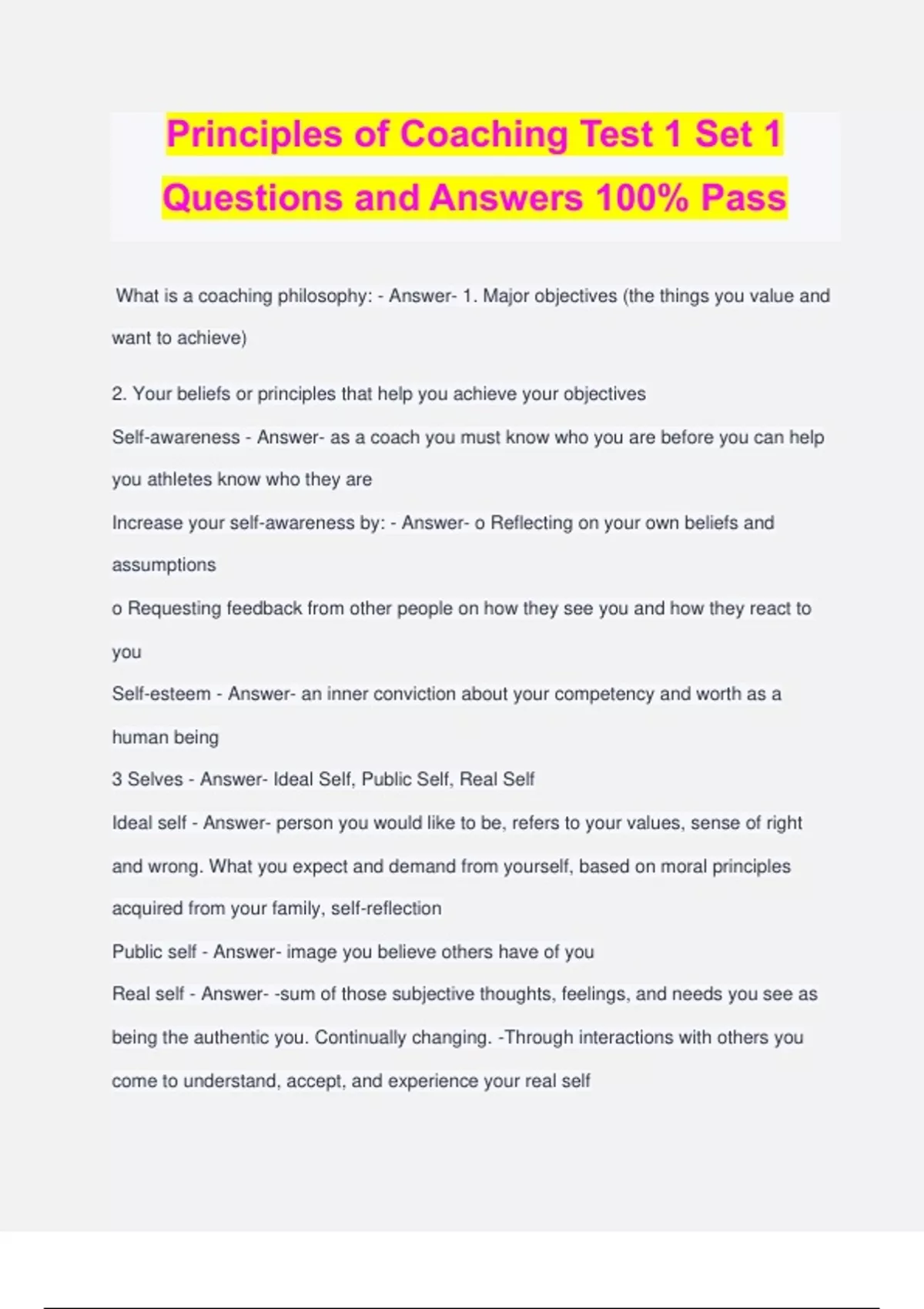 Principles of Coaching Test 1 Set 1 Questions and Answers 100% Pass What is a coaching philosophy: - Answer- 1. Major objectives (the things you value and want to achieve) 2. Your beliefs or principles that help you achieve your objectives Self-awareness - Answer- as a coach you must know who you are before you can help you athletes know who they are Increase your self-awareness by: - Answer- o Reflecting on your own beliefs and assumptions o Requesting feedback from other people on how they see you and how they react to you Self-esteem - Answer- an inner conviction about your competency and worth as a human being 3 Selves - Answer- Ideal Self, Public Self, Real Self Ideal self - Answer- person you would like to be, refers to your values, sense of right and wrong. What you expect and demand from yourself, based on moral principles acquired from your family, self-reflection Public self - Answer- image you believe others have of you Real self - Answer- -sum of those subjective thoughts, feelings, and needs you see as being the authentic you. Continually changing. -Through interactions with others you come to understand, accept, and experience your real self 3 Major objectives of coaching - Answer- 1. To win 2. To help young people have fun 3. To help young people develop a. Physically- by learning sport skills, improving physical conditioning, developing good health habits, avoiding injuries b. Psychologically- learning to control their emotions, developing feelings of self-worth c. Socially- learning cooperation in a competitive context, appropriate standards of behavior Know the 2 influences, how they need to be different based on the type of sport - Answer- Recreational programs- program and coaches must put an emphasis on learning and having fun rather than winning Competitive programs- program and coaches must put emphasis on winning What makes a winning philosophy? - Answer- Athletes first, winning second. Every decision you make and every behavior you display should be based first on what you judge is best for your athletes and second on what may improve the athletes or team's chances of winning Ethical behavior: - Answer- What is expected: morally sound decisions, placing the athletes well-being before winning, - What is not expected: making winning your first priority 3 Styles of Coaching - Answer- Command, Submissive, Cooperative Command - Answer- coaches make all the decisions, role of the athlete is to respond to the coaches commands Submissive - Answer- coaches make as few decisions as possible, a. Coaches adapt this style because: i. They lack the competence or confidence to provide instruction and guidance ii. Are unwilling/unable to devote the necessary time and effort to properly prepare iii. Believe this style is best for their athletes Cooperative - Answer- share decision making with their athletes, recognize young people cannot become responsible adults without learning to make decisions a. Challenge is providing the right balance between directing athletes and letting them direct themselves b. Coaches focus on teaching tactical and life skills Advantages/Disadvantages: Command Style - Answer- - Advantages: effective if winning is coaches primary objective