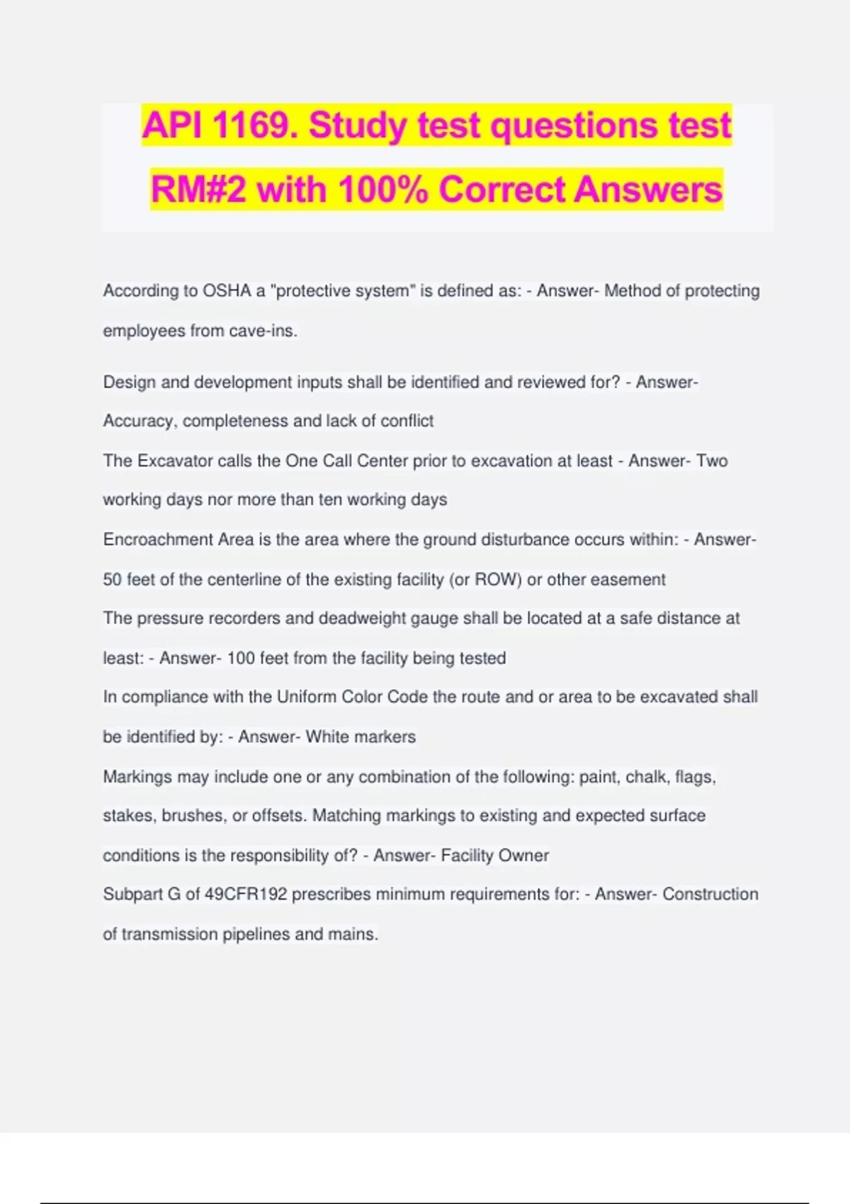 API 1169. Study test questions test RM#2 with 100% Correct Answers According to OSHA a "protective system" is defined as: - Answer- Method of protecting employees from cave-ins. Design and development inputs shall be identified and reviewed for? - Answer- Accuracy, completeness and lack of conflict The Excavator calls the One Call Center prior to excavation at least - Answer- Two working days nor more than ten working days Encroachment Area is the area where the ground disturbance occurs within: - Answer- 50 feet of the centerline of the existing facility (or ROW) or other easement The pressure recorders and deadweight gauge shall be located at a safe distance at least: - Answer- 100 feet from the facility being tested In compliance with the Uniform Color Code the route and or area to be excavated shall be identified by: - Answer- White markers Markings may include one or any combination of the following: paint, chalk, flags, stakes, brushes, or offsets. Matching markings to existing and expected surface conditions is the responsibility of? - Answer- Facility Owner Subpart G of 49CFR192 prescribes minimum requirements for: - Answer- Construction of transmission pipelines and mains. If a newspaper was seeking information about the project, are inspection personnel allowed to interac with them to answer their questions? - Answer- Only if expressly allowed Before placing new gas pipelines in service all piping and components must be subjected to: - Answer- 125% of MOP (maximum operational pressure) of the system for 4 hours A detailed design developed from operating requirements and conforming to Code requirements including all necessary drawings and specifications, goveming a liquid petroleum pipeline installation is also known as? - Answer- Engineering design Planned, systematic, and preventative actions that are required to ensure that materials, products and services will meet specified requirements is called? - Answer- Quality Control system Any physical objects detected by an in-line inspection device that may be anomalies, components, nearby metallic objects, or some other item are also known as? - Answer- Features Which describes "rework" the best? - Answer- Any grinding or welding on a completed weld to correct potentially rejectable indications General basic requirements for Chief Inspector qualification are? - Answer- Environmental and pollution contro