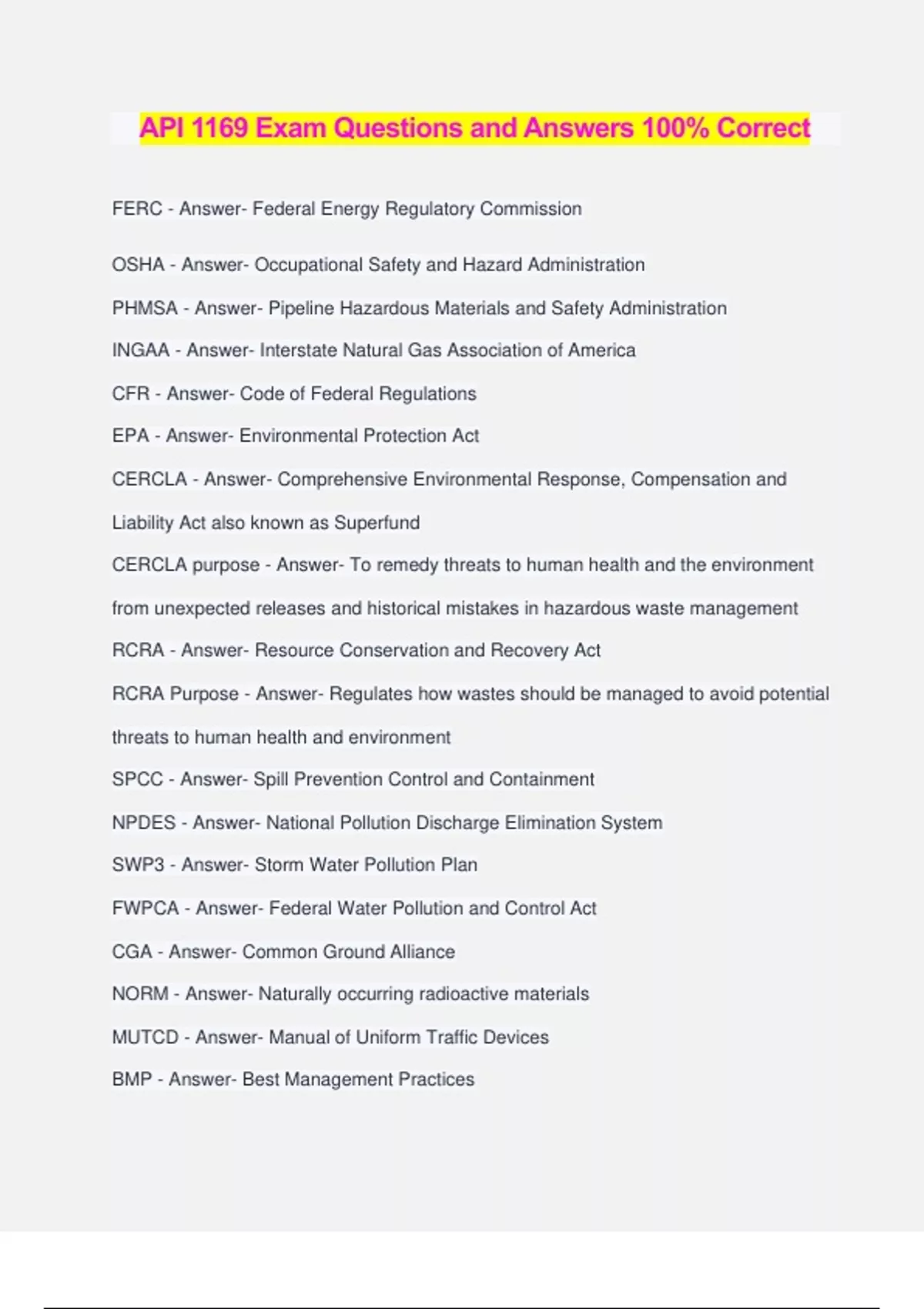 API 1169 Exam Questions and Answers 100% Correct FERC - Answer- Federal Energy Regulatory Commission OSHA - Answer- Occupational Safety and Hazard Administration PHMSA - Answer- Pipeline Hazardous Materials and Safety Administration INGAA - Answer- Interstate Natural Gas Association of America CFR - Answer- Code of Federal Regulations EPA - Answer- Environmental Protection Act CERCLA - Answer- Comprehensive Environmental Response, Compensation and Liability Act also known as Superfund CERCLA purpose - Answer- To remedy threats to human health and the environment from unexpected releases and historical mistakes in hazardous waste management RCRA - Answer- Resource Conservation and Recovery Act RCRA Purpose - Answer- Regulates how wastes should be managed to avoid potential threats to human health and environment SPCC - Answer- Spill Prevention Control and Containment NPDES - Answer- National Pollution Discharge Elimination System SWP3 - Answer- Storm Water Pollution Plan FWPCA - Answer- Federal Water Pollution and Control Act CGA - Answer- Common Ground Alliance NORM - Answer- Naturally occurring radioactive materials MUTCD - Answer- Manual of Uniform Traffic Devices BMP - Answer- Best Management Practices