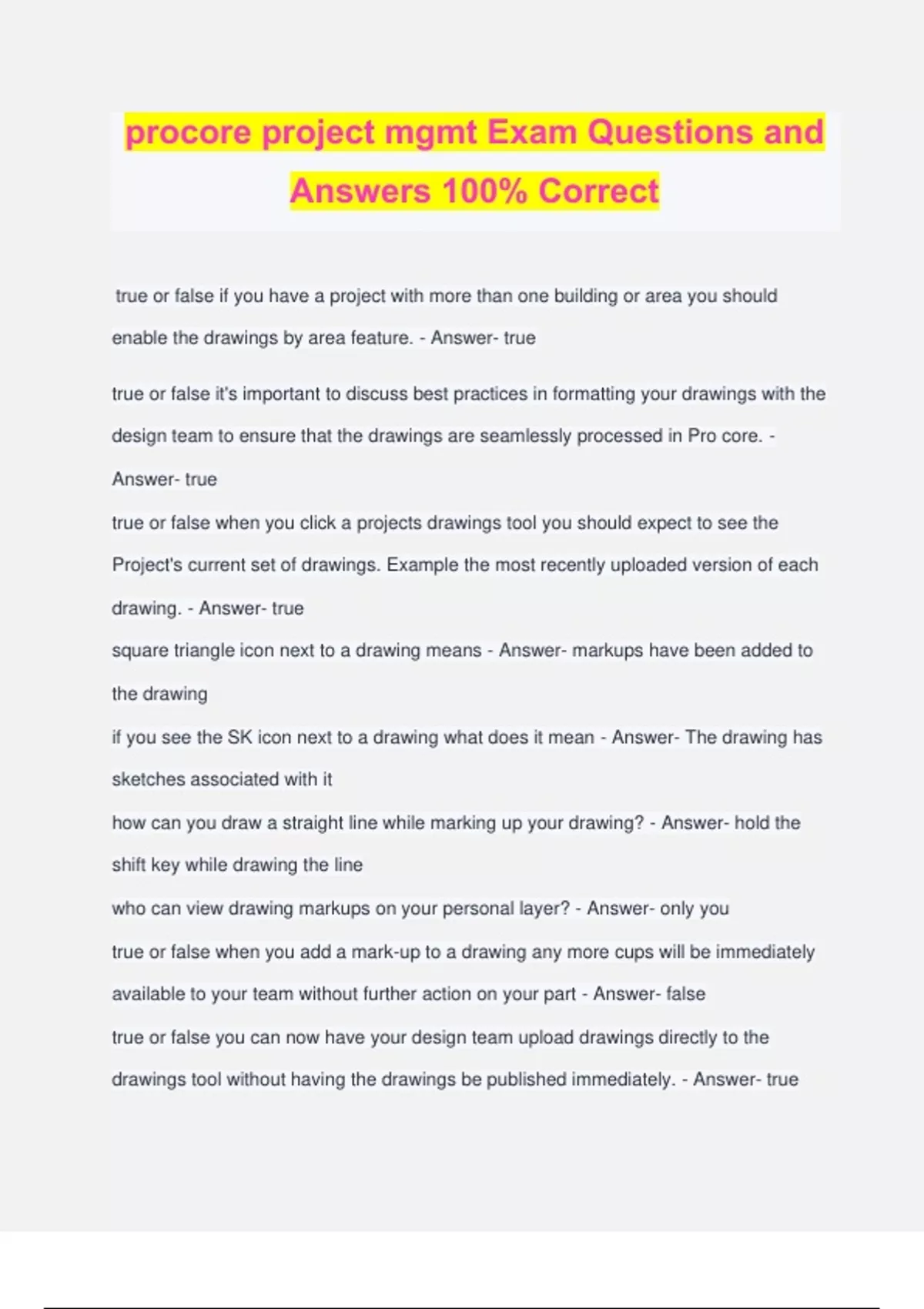 procore project mgmt Exam Questions and Answers 100% Correct true or false if you have a project with more than one building or area you should enable the drawings by area feature. - Answer- true true or false it's important to discuss best practices in formatting your drawings with the design team to ensure that the drawings are seamlessly processed in Pro core. - Answer- true true or false when you click a projects drawings tool you should expect to see the Project's current set of drawings. Example the most recently uploaded version of each drawing. - Answer- true square triangle icon next to a drawing means - Answer- markups have been added to the drawing if you see the SK icon next to a drawing what does it mean - Answer- The drawing has sketches associated with it how can you draw a straight line while marking up your drawing? - Answer- hold the shift key while drawing the line who can view drawing markups on your personal layer? - Answer- only you true or false when you add a mark-up to a drawing any more cups will be immediately available to your team without further action on your part - Answer- false true or false you can now have your design team upload drawings directly to the drawings tool without having the drawings be published immediately. - Answer- true you should upload shop drawings to procuras drawings tool - Answer- false true or false procore automatically send an email to users with admin permissions on the drawings tool when new drawings have been uploaded and are ready to be reviewed and published - Answer- true what is an important best practice you should communicate to the design team about the formatting of the spec book? - Answer- all of the above true or false before you publish your spec book to the team you should make sure there is a break between every spec section. - Answer- true true or false to upload a revision to your spec book you will first need to delete the old version from procore - Answer- false why are some action buttons inactive and gray? - Answer- because certain actions require that you first select one or more spec sections before the button becomes active in Orange true or false when you delete a specification from the specifications list page you will delete the specification and all of its revisions - Answer- false in Pro core what does it mean if a field has a blue carrot in the top corner of the cell? - Answer- the field is editable in line which action are you unable to perform from the PDF viewer of a spec section? - Answer- export as a CSV file true or false you can only access and view the project spec book in the specifications tool - Answer- false