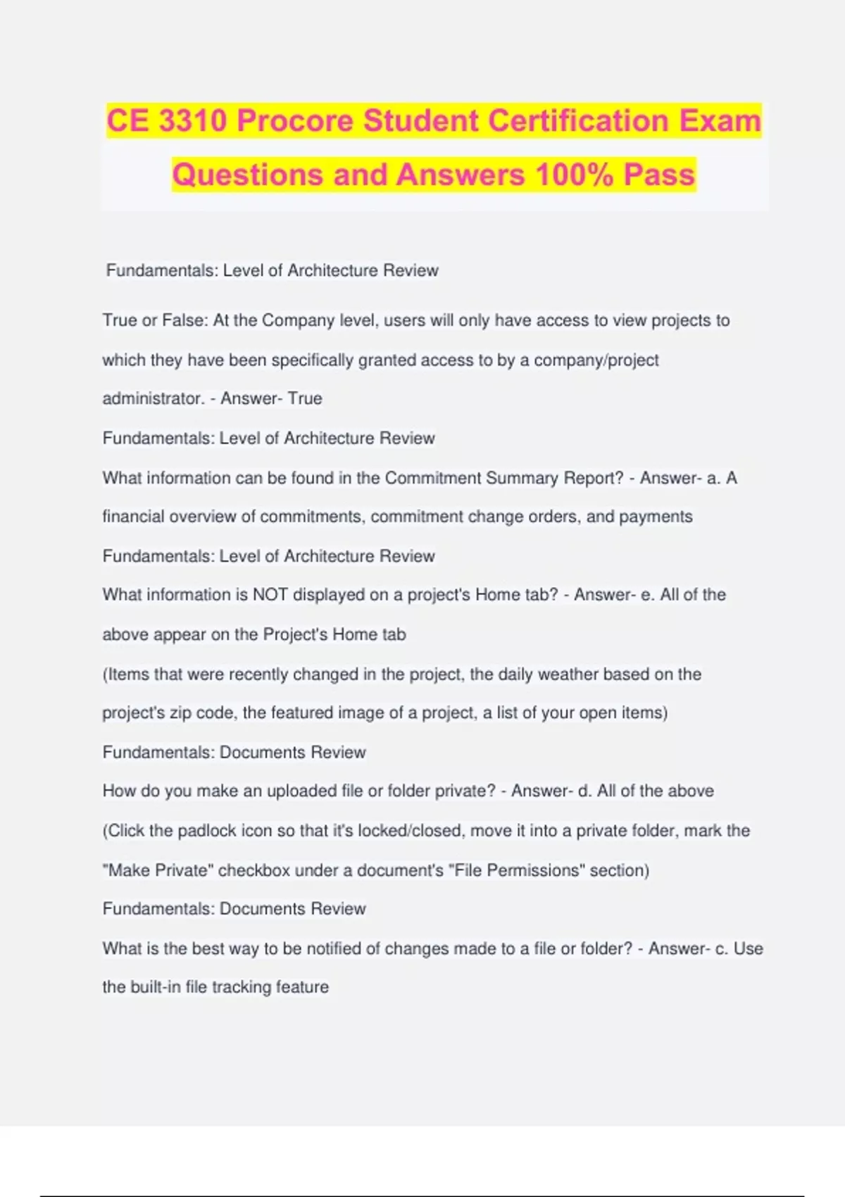 CE 3310 Procore Student Certification Exam Questions and Answers 100% Pass Fundamentals: Level of Architecture Review True or False: At the Company level, users will only have access to view projects to which they have been specifically granted access to by a company/project administrator. - Answer- True Fundamentals: Level of Architecture Review What information can be found in the Commitment Summary Report? - Answer- a. A financial overview of commitments, commitment change orders, and payments Fundamentals: Level of Architecture Review What information is NOT displayed on a project's Home tab? - Answer- e. All of the above appear on the Project's Home tab (Items that were recently changed in the project, the daily weather based on the project's zip code, the featured image of a project, a list of your open items) Fundamentals: Documents Review How do you make an uploaded file or folder private? - Answer- d. All of the above (Click the padlock icon so that it's locked/closed, move it into a private folder, mark the "Make Private" checkbox under a document's "File Permissions" section) Fundamentals: Documents Review What is the best way to be notified of changes made to a file or folder? - Answer- c. Use the built-in file tracking feature Fundamentals: Documents Review True or False: Previously uploaded versions/revisions of a file are preserved in Procore and are available for download in the file's Version Log. - Answer- True Fundamentals: Documents Review How do you add a document to a project? - Answer- e. All of the above (Send a file to the project's unique email address, upload a file using Procore's Windows Desktop application, Procore Drive, drag and drop a file into a folder's designated "Upload Queue" section, or click the "Browse" button to select a file from your local computer) Fundamentals: Documents Review True or False: There is no way to validate whether or not a user (who has access to view the file) has downloaded the file from Procore. - Answer- False Fundamentals: Upload Drawings Review True or False: If you upload a multi-page drawing set (as a single PDF), Procore will automatically split up the set into individual drawings. - Answer- a. True Fundamentals: Upload Drawings Review Once a drawing has been reviewed and published, which of the following data fields can still be edited/changed? Number Title Revision Number Dates Discipline - Answer- c. All of the drawing fields listed above