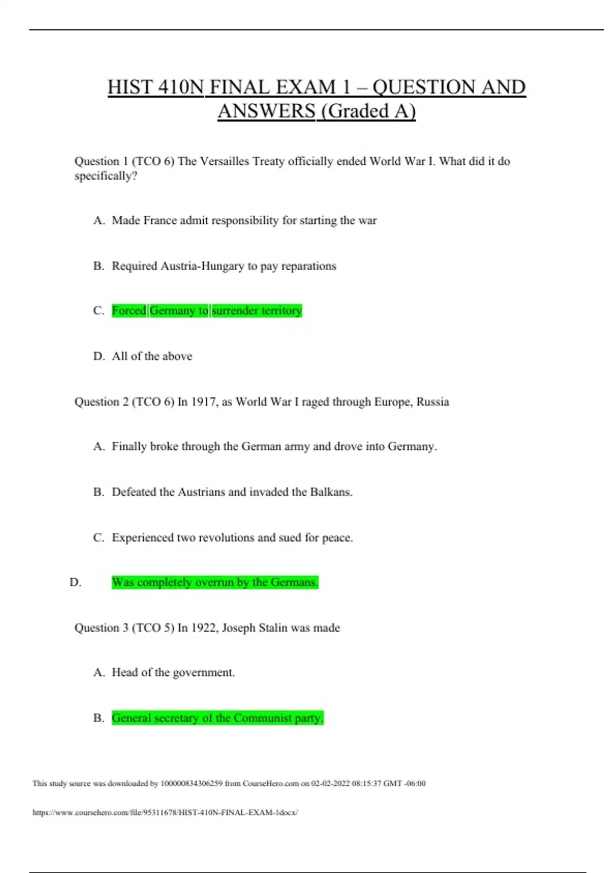 HIST 410N FINAL EXAM 1 – QUESTION AND ANSWERS (Graded A) Question 1 (TCO 6) The Versailles Treaty officially ended World War I. What did it do specifically? A. Made France admit responsibility for starting the war B. Required Austria-Hungary to pay reparations C. Forced Germany to surrender territory D. All of the above Question 2 (TCO 6) In 1917, as World War I raged through Europe, Russia A. Finally broke through the German army and drove into Germany. B. Defeated the Austrians and invaded the Balkans. C. Experienced two revolutions and sued for peace. D. Was completely overrun by the Germans. Question 3 (TCO 5) In 1922, Joseph Stalin was made A. Head of the government. B. General secretary of the Communist party. C. General secretary of the Comintern. D. Head of the Red Army. Question 4 (TCO 5) What event marked the beginning of World War II? A. The Nazi-Soviet Pact B. The German invasion of Poland C. The Anschluss D. Germany's annexation of the Sudetenland Question 5 (TCO 9) What city was divided during the Cold War and became a hotspot for espionage and intrigue? A. Paris B. London C. Berlin D. Rome