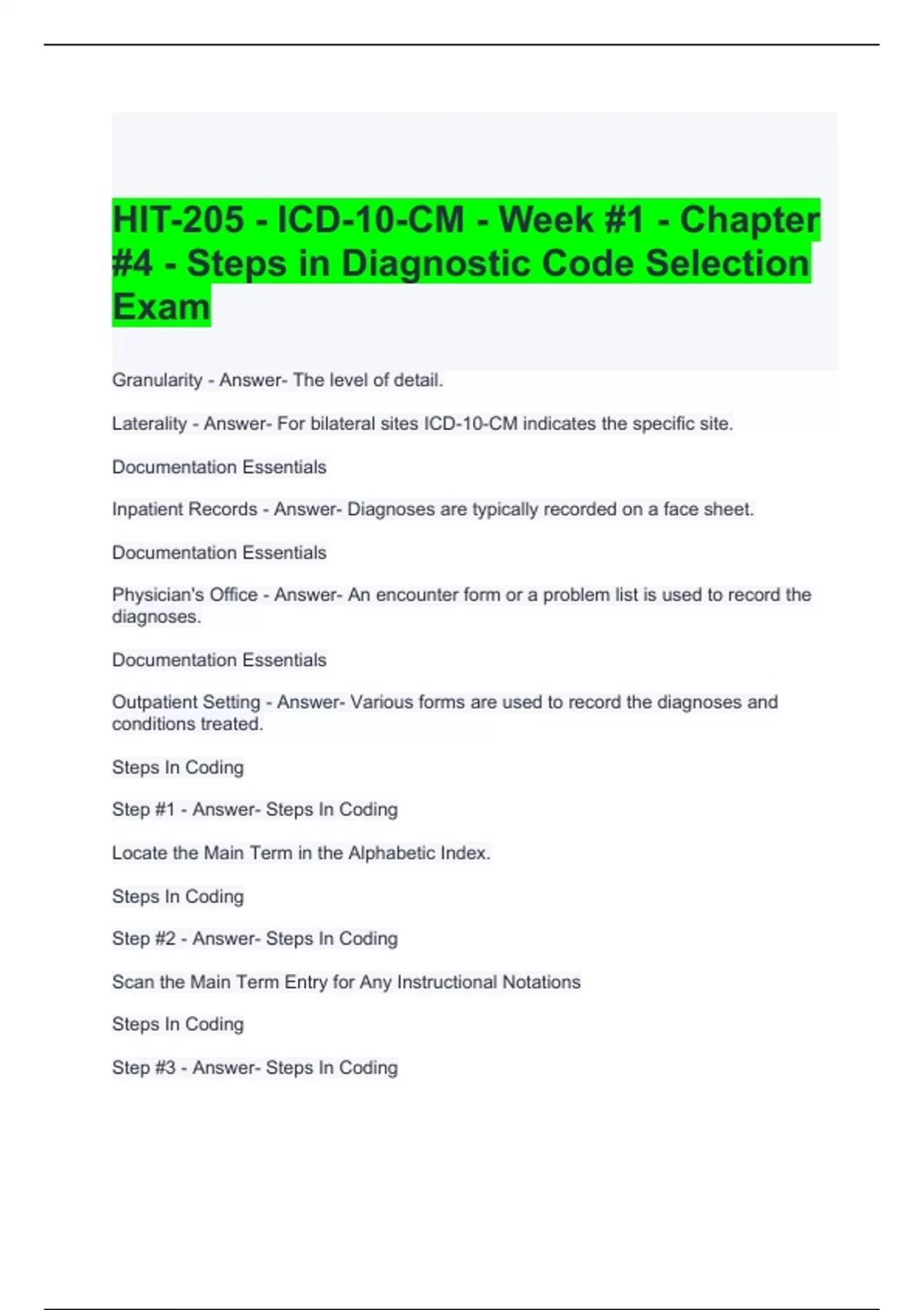 HIT-205 - ICD-10-CM - Week #1 - Chapter #4 - Steps in Diagnostic Code Selection Exam 2024