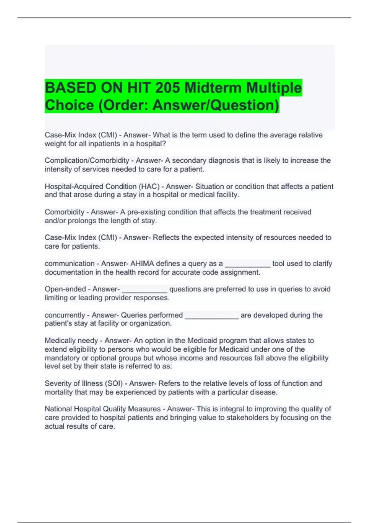 BASED ON HIT 205 Midterm Multiple Choice (Order Answer-Question)