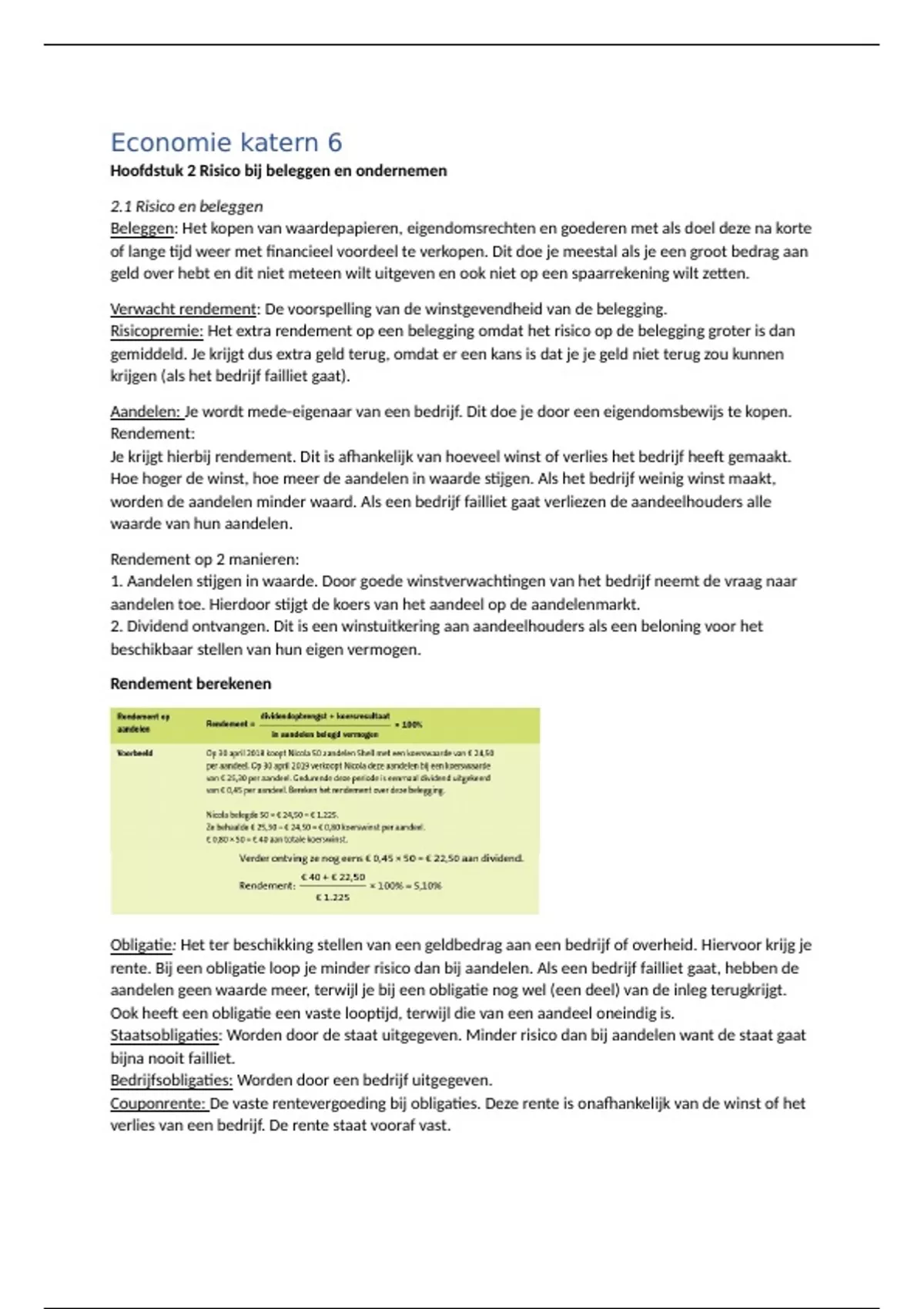 Samenvatting economie. Boek: Pincode Katern 6. Hoofdstuk 2: Risico bij beleggen en ondernemen 5 vwo.