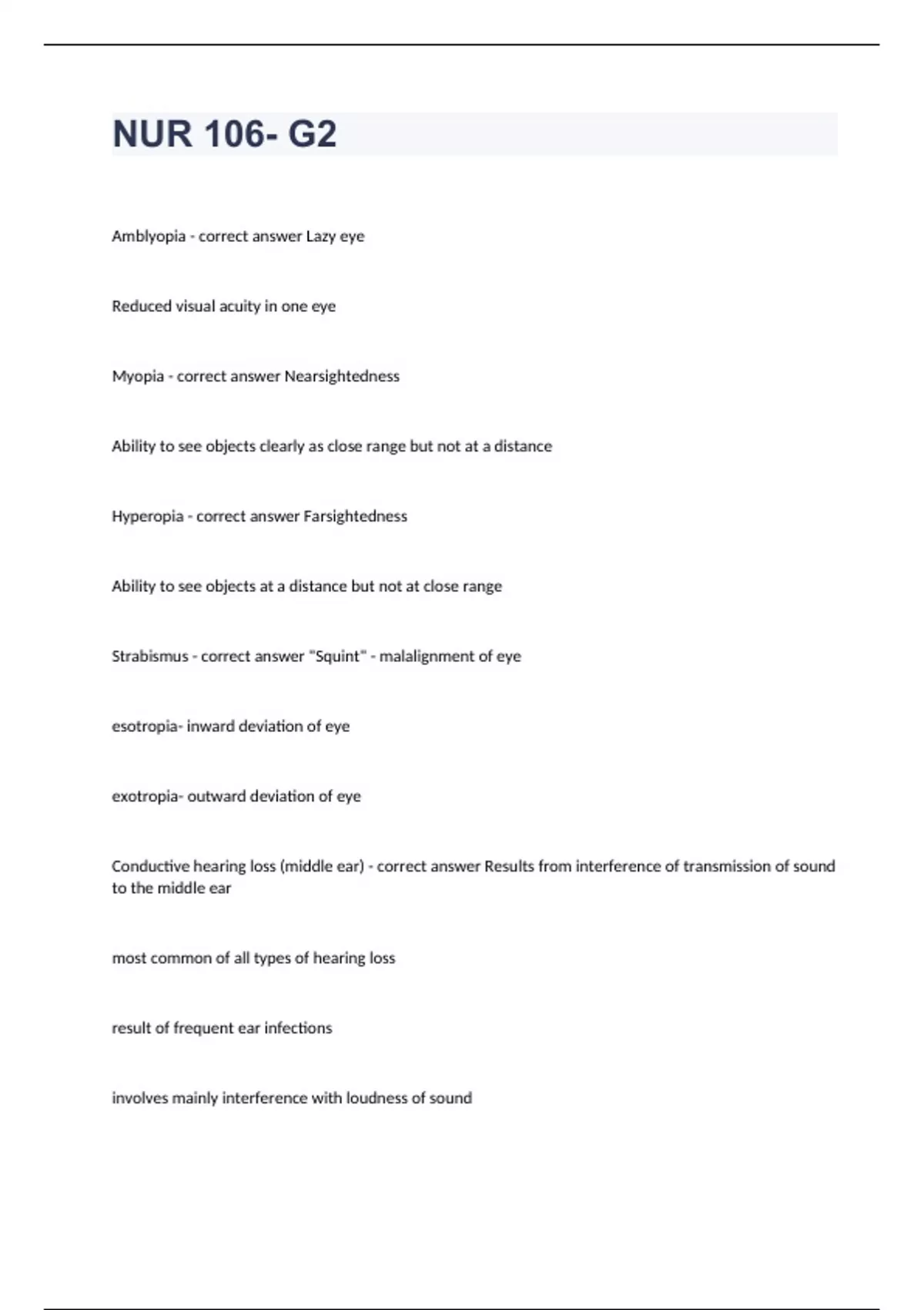 NUR 106- G2 Final Exam Questions 2024.Amblyopia - correct answer Lazy eye Reduced visual acuity in one eye Myopia - correct answer Nearsightedness Ability to see objects clearly as close range but not at a distance Hyperopia - correct answer Farsightedness Ability to see objects at a distance but not at close range Strabismus - correct answer "Squint" - malalignment of eye esotropia- inward deviation of eye exotropia- outward deviation of eye Conductive hearing loss (middle ear) - correct answer Results from interference of transmission of sound to the middle ear most common of all types of hearing loss result of frequent ear infections involves mainly interference with loudness of sound Sensorineural hearing loss - correct answer involves damage to the inner ear structures or the auditory nerve common causes: -congenital defects -consequences of acquired conditions (kernicterus, infection, ototoxic drugs) -exposure to excessive noise the sounds are distorted, severely affecting discrimination and comprehension myringotomy - correct answer a surgical incision of the eardrum alleviate the severe pain of AOM or OME drain infected middle ear fluid in the presence of complications