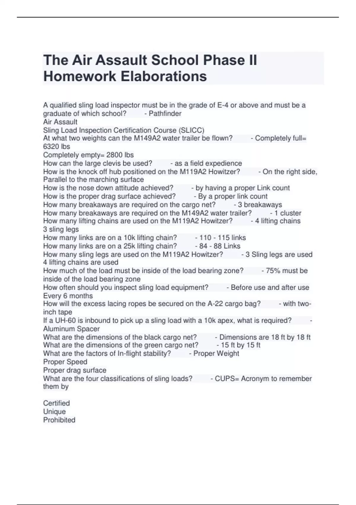 The Air Assault School Phase II Homework Elaborations A qualified sling load inspector must be in the grade of E-4 or above and must be a graduate of which school? - Pathfinder Air Assault Sling Load Inspection Certification Course (SLICC) At what two weights can the M149A2 water trailer be flown? - Completely full= 6320 lbs Completely empty= 2800 lbs How can the large clevis be used? - as a field expedience How is the knock off hub positioned on the M119A2 Howitzer? - On the right side, Parallel to the marching surface How is the nose down attitude achieved? - by having a proper Link count How is the proper drag surface achieved? - By a proper link count How many breakaways are required on the cargo net? - 3 breakaways How many breakaways are required on the M149A2 water trailer? - 1 cluster How many lifting chains are used on the M119A2 Howitzer? - 4 lifting chains 3 sling legs How many links are on a 10k lifting chain? - 110 - 115 links How many links are on a 25k lifting chain? - 84 - 88 Links How many sling legs are used on the M119A2 Howitzer? - 3 Sling legs are used 4 lifting chains are used How much of the load must be inside of the load bearing zone? - 75% must be inside of the load bearing zone How often should you inspect sling load equipment? - Before use and after use Every 6 months How will the excess lacing ropes be secured on the A-22 cargo bag? - with two- inch tape If a UH-60 is inbound to pick up a sling load with a 10k apex, what is required? - Aluminum Spacer What are the dimensions of the black cargo net? - Dimensions are 18 ft by 18 ft What are the dimensions of the green cargo net? - 15 ft by 15 ft What are the factors of In-flight stability? - Proper Weight Proper Speed Proper drag surface What are the four classifications of sling loads? - CUPS= Acronym to remember them by Certified Unique Prohibited Suitable What are the phases of a sling load operation? - 1. Preparation and Rigging 2. Inspection of Preparation and Rigging 3. Sling load operation itself What are the primary and secondary means of securing the tow pintle on the M1151 uparmored HMMWV - Type III Nylon (550 cord) 2 in tape What are the three types of lacing ropes you can use with the A-22 cargo bag? - Type III Nylon (550 cord) 3/8 in Hemp Rope 7/16 Nylon Rope (Swiss Seat rope) What are the three units involved in sling load operations? - 1. Supported (The {ed} on supported is important if you say support{ing} it will be wrong) 2. Aviation 3. Receiver What classification of sling load has flown for years without incident? - Suitable Sling loads What classification of sling load required a high risk approval Authority's signature? - Unique sling loads and it takes the first 0-6 in Chain of Command What classifications of sling loads can the CHRP be used on? - All loads and all sling loads The acronym to remember the classification is CUPS What is rated capacity of Type III Nylon (550 cord)? - 550 lbs What is the allowable cargo load (ACL) of the M1151 uparmored HMMWV? - 4,200 lbs What is the average empty weight of a single fuel blivet? - 250 lbs What is the diameter of the 10k apex pin portion? - 1-1/8 inch diameter What is the diameter of the 25k apex pin portion? - 1-1/2 inche