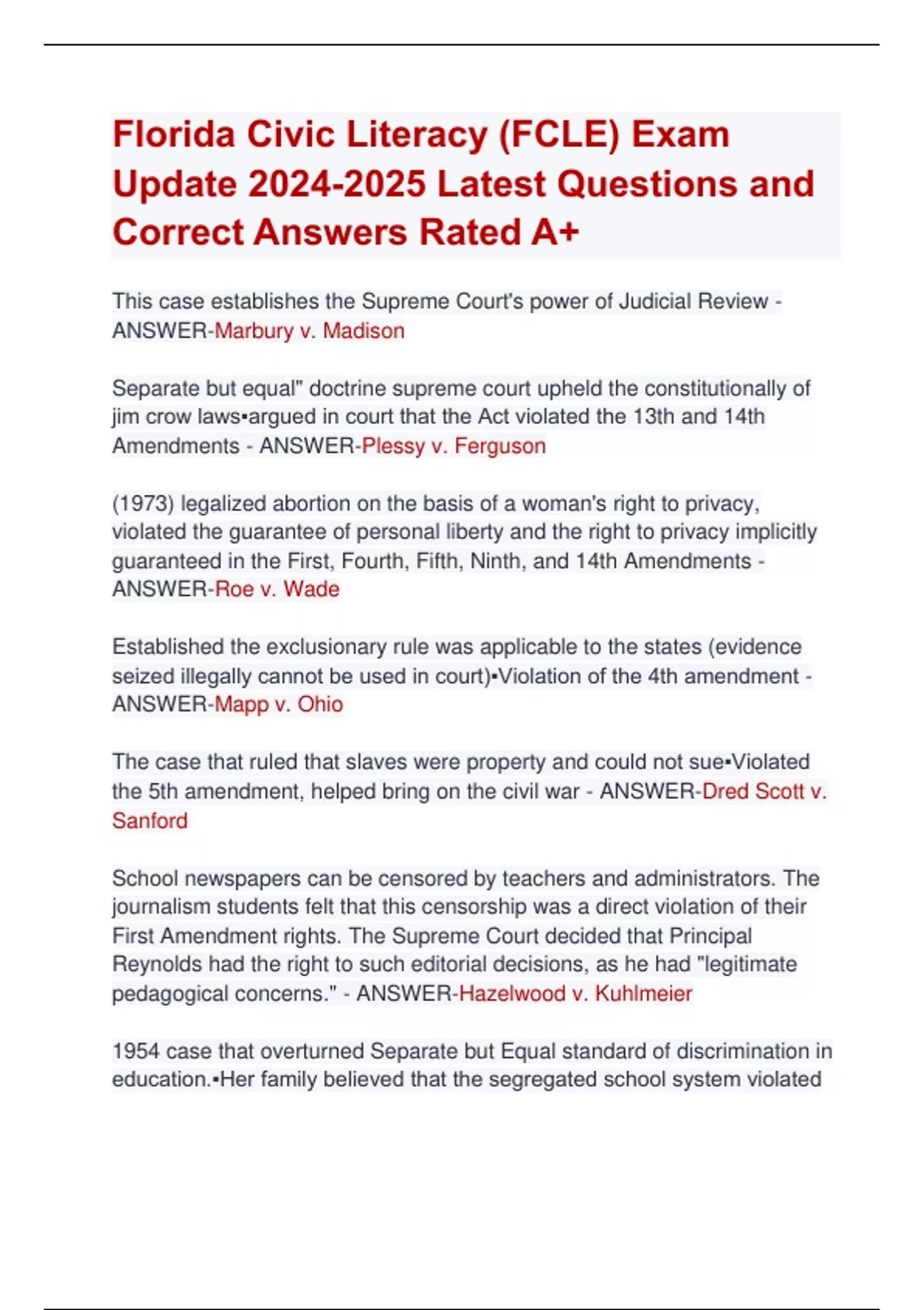 Florida Civic Literacy (FCLE) Exam Update Latest Questions and Correct Answers Rated A+