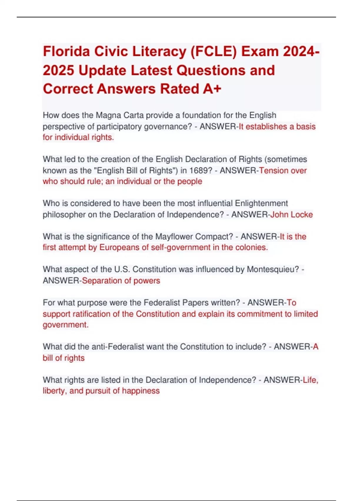 Florida Civic Literacy (FCLE) Exam 2024- 2025 Update Latest Questions and Correct Answers Rated A+