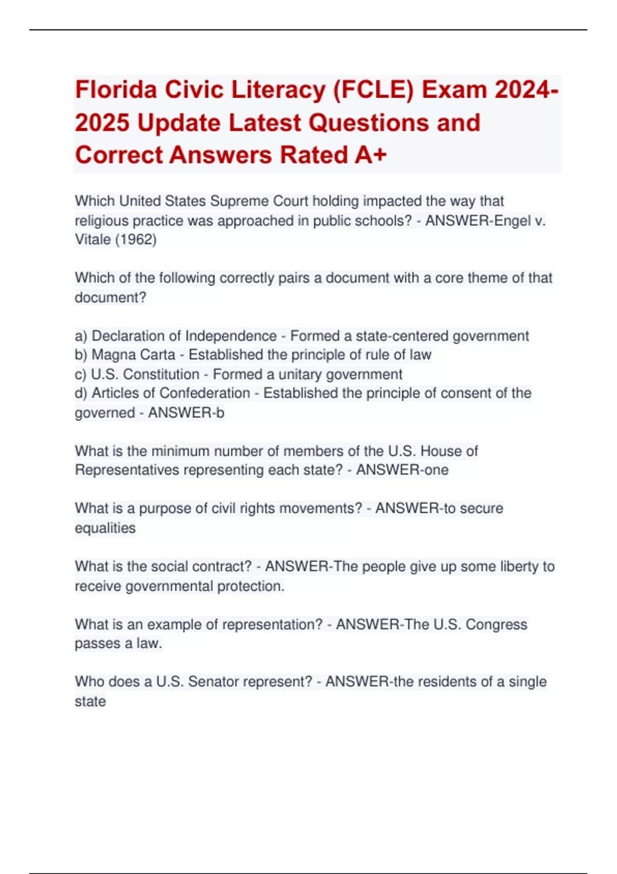 Florida Civic Literacy (FCLE) Exam 2024- 2025 Update Latest Questions and Correct Answers Rated A+