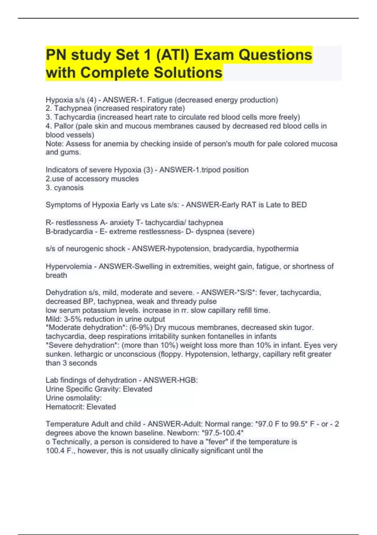 Hypoxia s/s (4) - ANSWER-1. Fatigue (decreased energy production) 2. Tachypnea (increased respiratory rate) 3. Tachycardia (increased heart rate to circulate red blood cells more freely) 4. Pallor (pale skin and mucous membranes caused by decreased red blood cells in blood vessels) Note: Assess for anemia by checking inside of person's mouth for pale colored mucosa and gums. Indicators of severe Hypoxia (3) - ANSWER-d position of accessory muscles 3. cyanosis Symptoms of Hypoxia Early vs Late s/s: - ANSWER-Early RAT is Late to BED R- restlessness A- anxiety T- tachycardia/ tachypnea B-bradycardia - E- extreme restlessness- D- dyspnea (severe) s/s of neurogenic shock - ANSWER-hypotension, bradycardia, hypothermia Hypervolemia - ANSWER-Swelling in extremities, weight gain, fatigue, or shortness of breath Dehydration s/s, mild, moderate and severe. - ANSWER-*S/S*: fever, tachycardia, decreased BP, tachypnea, weak and thready pulse low serum potassium levels. increase in rr. slow capillary refill time. Mild: 3-5% reduction in urine output *Moderate dehydration*: (6-9%) Dry mucous membranes, decreased skin tugor. tachycardia, deep respirations irritability sunken fontanelles in infants *Severe dehydration*: (more than 10%) weight loss more than 10% in infant. Eyes very sunken. lethargic or unconscious (floppy. Hypotension, lethargy, capillary refit greater than 3 seconds Lab findings of dehydration - ANSWER-HGB: Urine Specific Gravity: Elevated Urine osmolality: Hematocrit: Elevated Temperature Adult and child - ANSWER-Adult: Normal range: *97.0 F to 99.5* F - or - 2 degrees above the known baseline. Newborn: *97.5-100.4* o Technically, a person is considered to have a "fever" if the temperature is 100.4 F., however, this is not usually clinically significant until the