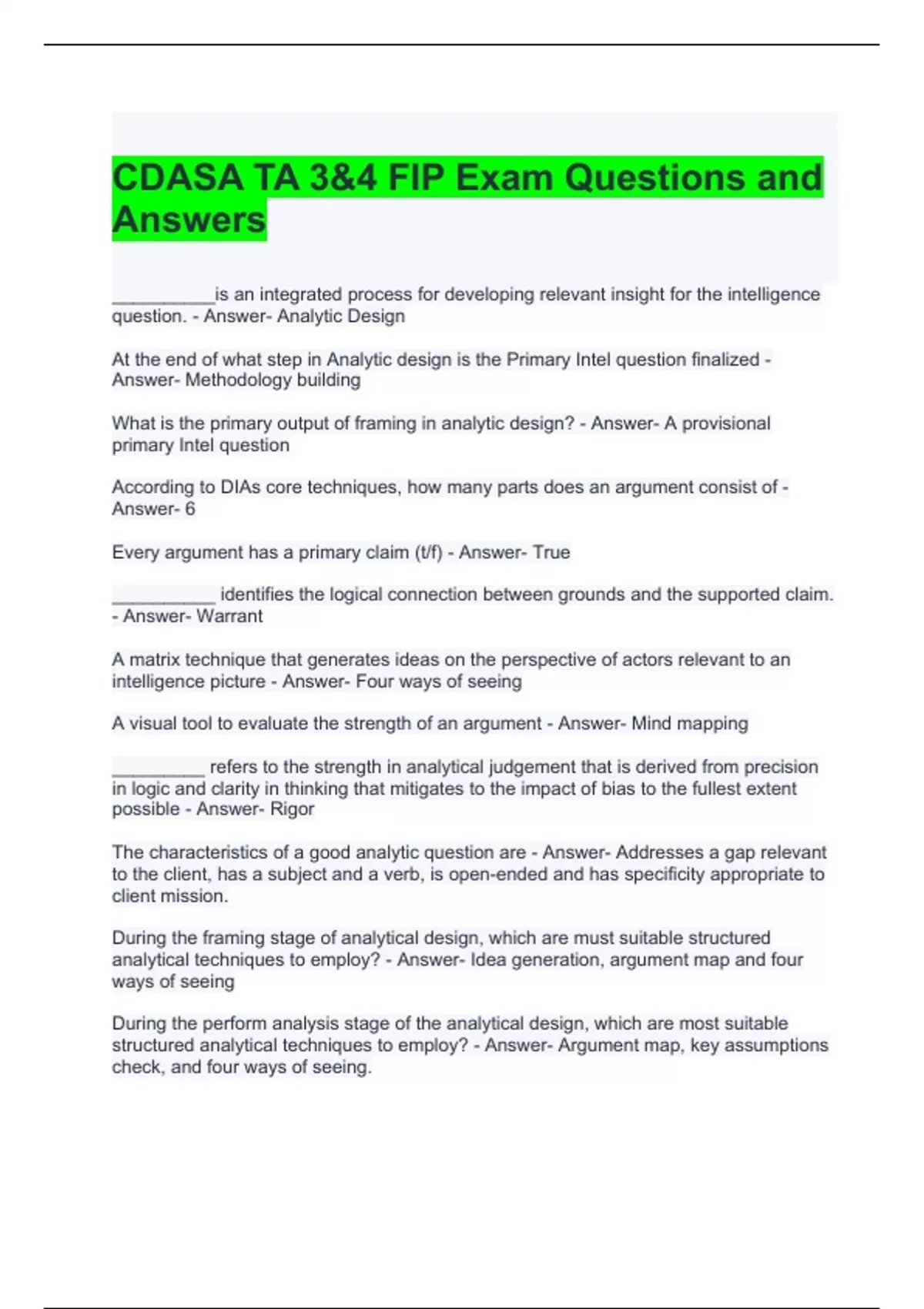 CDASA TA 3&4 FIP Exam Questions and Answers