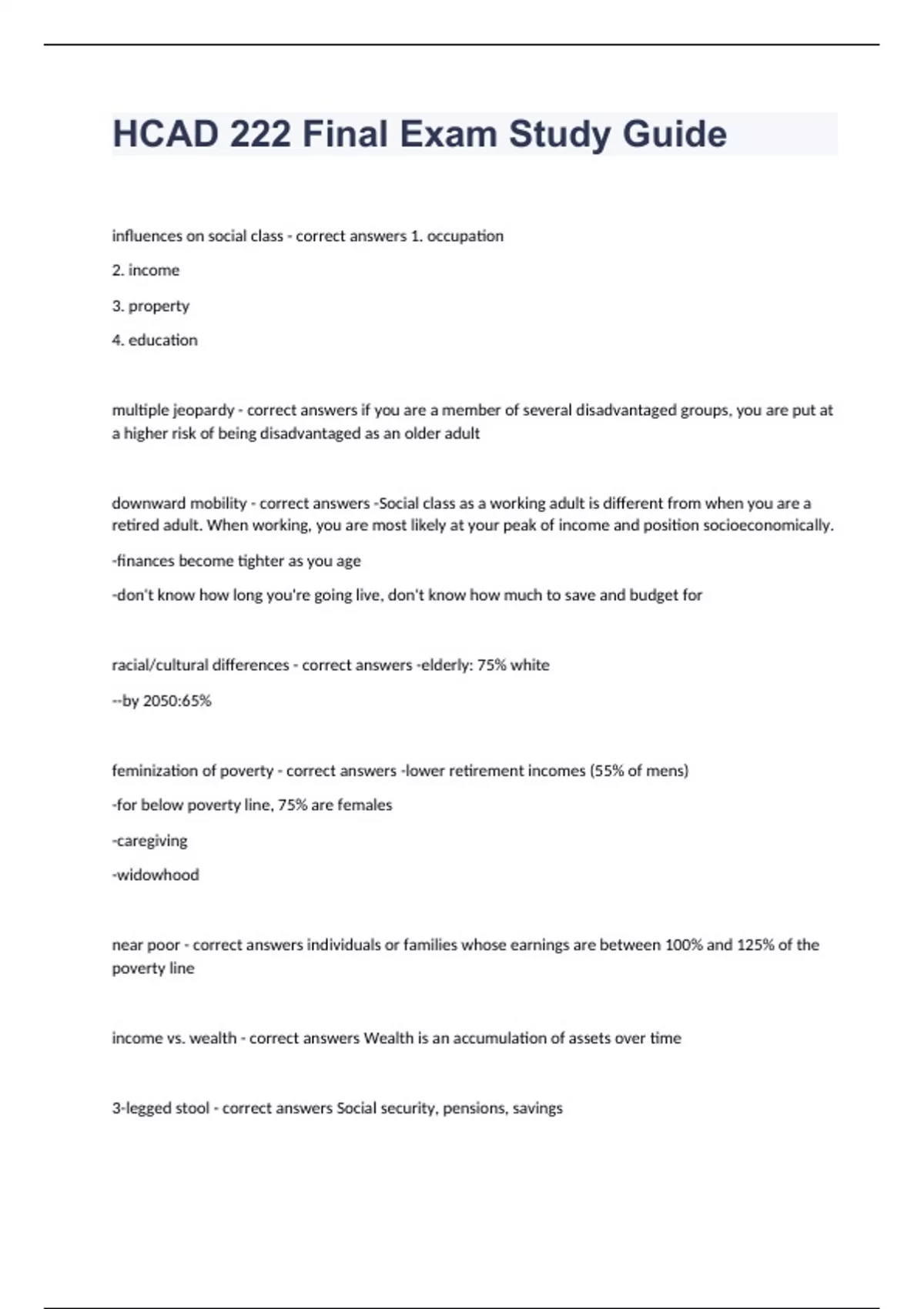 HCAD 222 Final Exam Study Guide Exam 2024. A majority of the 65+ are - correct answers white, minorities rising How do social classes affect aging - correct answers unequal shares of wealth, status, and power what are the four elements influence class position - correct answers occupation income property education Old age _________________ poverty and economic vulnerability - correct answers doesnt equal How has poverty among the old changed - correct answers -large reduction over past 30 years -biggest gains in the 60s and 70s SSI - correct answers Supplemental Security Income -means tested - cash benefit program for elderly, blind, disabled Cumulative Disadvantage - correct answers Lower SES over the life course tends to produce cumulative disadvantage, which is perpetuated in old age What is "double jeopardy" or "Multiple Jeopardy - correct answers suggests that if you are a member of more than one disadvantaged group, the effects are multiplied Poverty rates are - correct answers higher for older adults