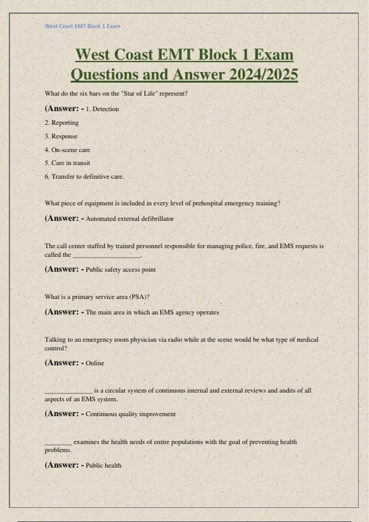 West Coast EMT Block 1 Exam Questions and Answer 2024/2025