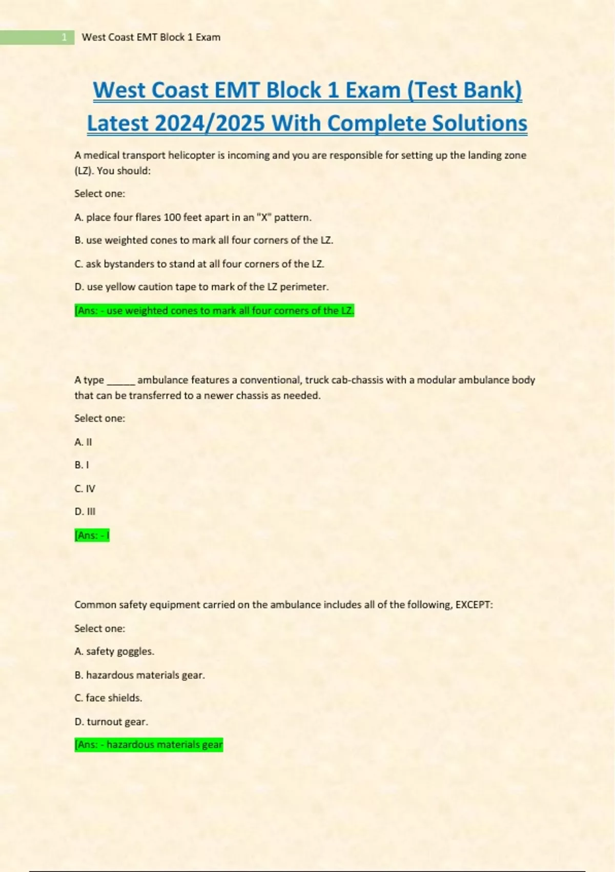 West Coast EMT Block 1 Exam (Test Bank) Latest 2024/2025 With Complete Solutions