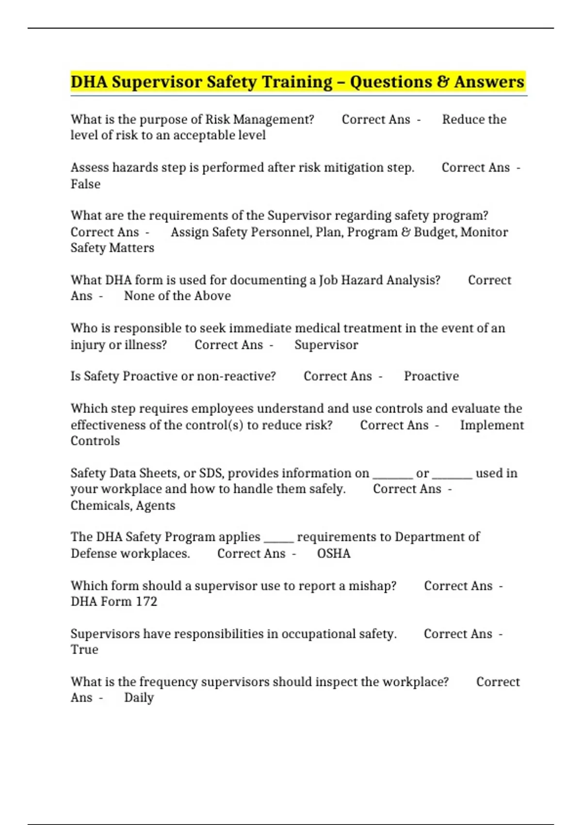 Which form should a supervisor use to report a mishap? Correct Ans - DHA Form 172