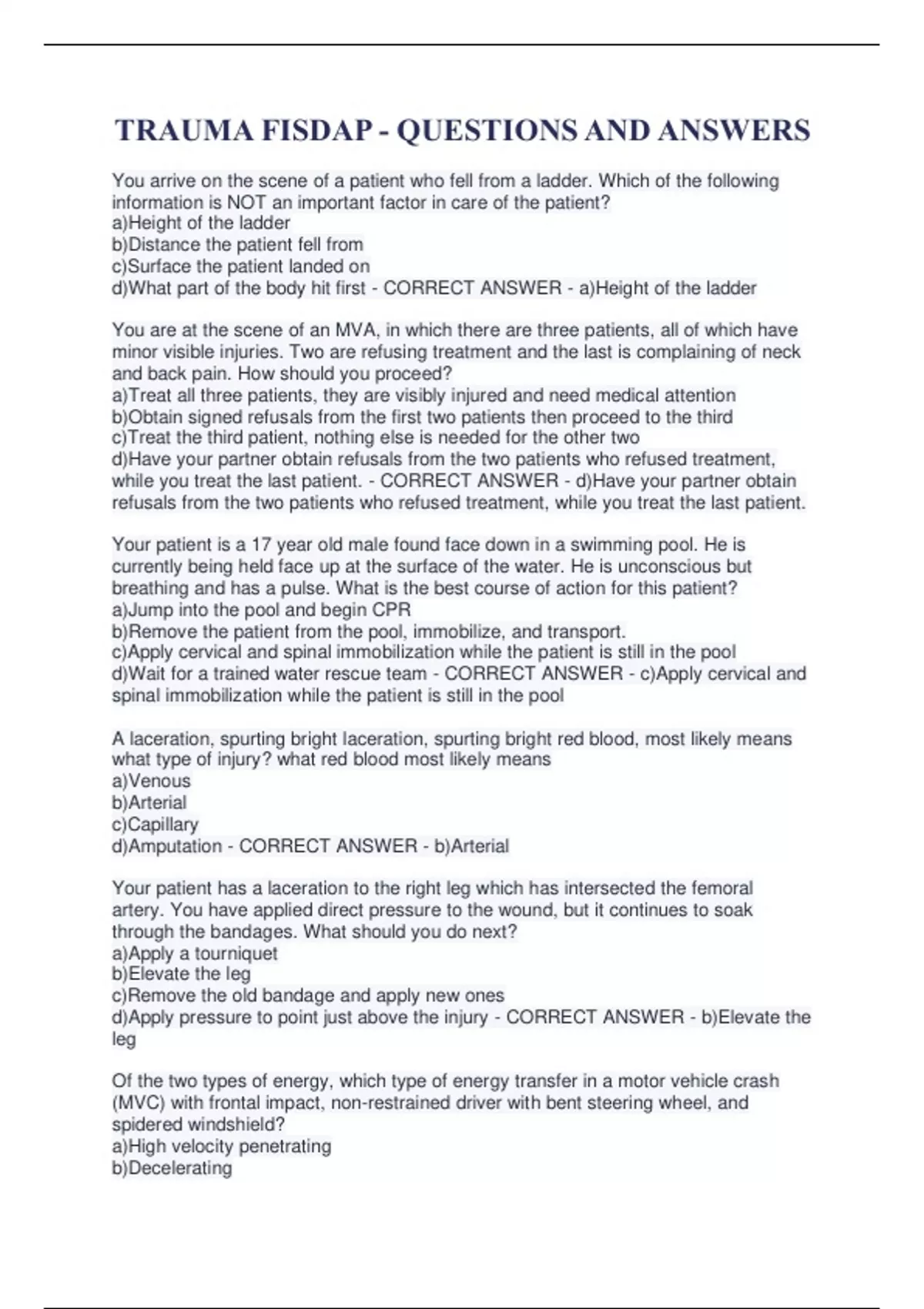 TRAUMA FISDAP - QUESTIONS AND ANSWERS You arrive on the scene of a patient who fell from a ladder. Which of the following information is NOT an important factor in care of the patient? a)Height of the ladder b)Distance the patient fell from c)Surface the patient landed on d)What part of the body hit first - CORRECT ANSWER - a)Height of the ladder You are at the scene of an MVA, in which there are three patients, all of which have minor visible injuries. Two are refusing treatment and the last is complaining of neck and back pain. How should you proceed? a)Treat all three patients, they are visibly injured and need medical attention b)Obtain signed refusals from the first two patients then proceed to the third c)Treat the third patient, nothing else is needed for the other two d)Have your partner obtain refusals from the two patients who refused treatment, while you treat the last patient. - CORRECT ANSWER - d)Have your partner obtain refusals from the two patients who refused treatment, while you treat the last patient. Your patient is a 17 year old male found face down in a swimming pool. He is currently being held face up at the surface of the water. He is unconscious but breathing and has a pulse. What is the best course of action for this patient? a)Jump into the pool and begin CPR b)Remove the patient from the pool, immobilize, and transport. c)Apply cervical and spinal immobilization while the patient is still in the pool d)Wait for a trained water rescue team - CORRECT ANSWER - c)Apply cervical and spinal immobilization while the patient is still in the pool A laceration, spurting bright laceration, spurting bright red blood, most likely means what type of injury? what red blood most likely means a)Venous b)Arterial c)Capillary d)Amputation - CORRECT ANSWER - b)Arterial Your patient has a laceration to the right leg which has intersected the femoral artery. You have applied direct pressure to the wound, but it continues to soak through the bandages. What should you do next? a)Apply a tourniquet b)Elevate the leg c)Remove the old bandage and apply new ones d)Apply pressure to point just above the injury - CORRECT ANSWER - b)Elevate the leg Of the two types of energy, which type of energy transfer in a motor vehicle crash (MVC) with frontal impact, non-restrained driver with bent steering wheel, and spidered windshield? a)High velocity penetrating b)Decelerating c)Low velocity penetrating d)Blunt - CORRECT ANSWER - d)Blunt Any penetrating missile traveling over 2,000 ft/sec would be classified as? a)Low velocity b)Medium velocity c)High velocity d)Decelerating - CORRECT ANSWER - c)High velocity When there is penetrating trauma there is a permanent cavity which is formed by the projectile contacting the tissues. How is a temporary cavity formed? a)By the twisting of the projectile b)By energy scrubbing off of the projectile c)The wadding entering the body d)Unspent gun powder - CORRECT ANSWER - b)By energy scrubbing off of the projectile The way a patient is injured is often referred to as the _______________? a)Mechanism of injury b)Nature of illness c)Injury pattern d)Energy transfer - CORRECT ANSWER - a)Mechanism of injury When approaching a scene of trauma incident, what is your first order of business? a)Airway b)C-Spine control c)Body substance Isolation d)Scene safety - CORRECT ANSWER - d)Scene safety A large collection of blood under the skin is known as? a)Contusion b)Abrasion c)Hematoma d)Bruise - CORRECT ANSWER - c)Hematoma Your trauma patient has her left hand caught between rollers on a conveyor belt. Extrication takes 30 minutes. Evaluation of the injury during extrication showed delayed capillary refill distal to the injury. Post extrication shows rapid capillary refill distal to the injury deformity mid-palm. There are no obvious fractures, no lacerations, and minor swelling. Knowing that crush injuries can cause many other problems, which is NOT considered a crush injury complication? a)Compression of tissues b)Fractures c)No injury at all d)Compartment syndrome - CORRECT ANSWER - c)No injury at all Loss of tissue in a traumatic event can be: just soft tissue, a portion of an extremity, or an entire extremity. If your patient has lost the distal one-third of a lower extremity, what would that injury be called? a)Amplitude