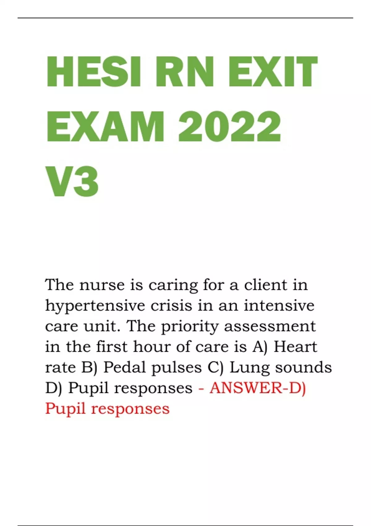 HESI RN EXIT EXAM 2022 V3 The nurse is caring for a client in hypertensive crisis in an intensive care unit. The priority assessment in the first hour of care is A) Heart rate B) Pedal pulses C) Lung sounds D) Pupil responses - ANSWER-D) Pupil responses The nurse is evaluating a tertiary prevention program for clients with cardiovascular disease implemented in a rural health clinic. Which outcome indicate the program is effective? a. At-risk clients received an increased number of routine health screenings. b. Clients reported having new confidence in making healthy food choices. c. Clients who incurred disease complications promptly received rehabilitation. d. Client relapse rate of 30% in a 5- year community-wide anti-smoking campaign. - ANSWER-c. Clients who incurred disease complications promptly received rehabilitation. The nurse is caring for a client with chronic obstructive pulmonary disease (COPD) who uses oxygen at 2 L/minute per nasal cannula continuously. The nurse observes that the client is having increased shortness of breath with respirations at 23 breaths/minute. Which action should the nurse implement first? a. Determine if the client is experiencing any anxiety. b. Auscultate the client's bilateral lung sounds and oxygen saturation. c. Notify the healthcare provider about the client's distress. d. Assess the delivery mechanism of the oxygen tank, tubing, and cannula. - ANSWER-d. Assess the delivery mechanism of the oxygen tank, tubing, and cannula. A male client with stomach cancer returns to the unit following a total gastrectomy. He has a nasogastric tube to suction and is receiving Lactated Ringer's solution at 75 mL/hour IV. One hour after admission to the unit, the nurse notes 300 mL of blood in the suction canister, the client's heart rate is 155 beats/minute, and his blood pressure is 78/48 mmHg. In addition to reporting the finding to the surgeon. Which action should the nurse implement first? a. Measure and document the client's urinary output. b. Request the client's reserved unit if packed red blood cells. c. Prepare the placement of a central venous catheter. d. Increase the infusion rate of Lactated Ringer's solution. - ANSWER-d. Increase the infusion rate of Lactated Ringer's solution. an adult male who fell 20 feet from the roof of this home has multiple