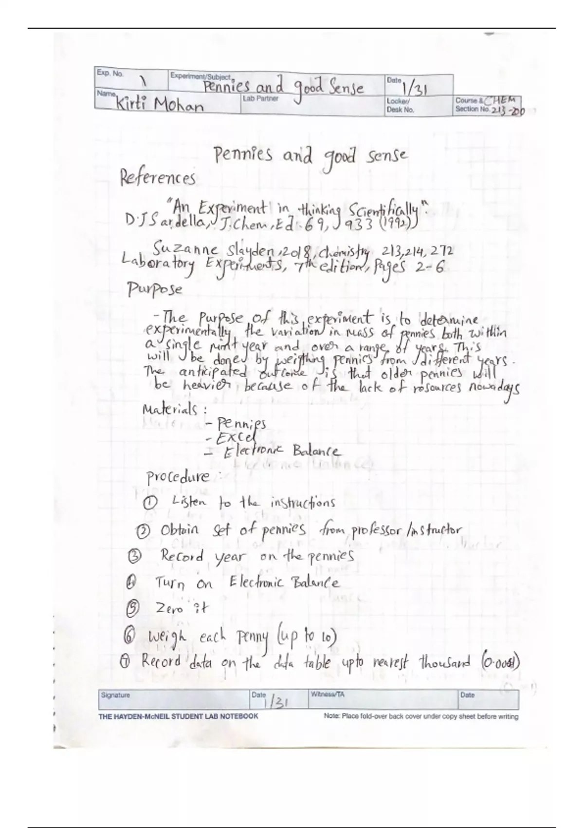 This document appears to be a lab report examining the variation in mass of U.S. pennies over different mint years. The key components are: Table of Data The report includes a data table (Table 1) showing the masses in grams of 6-10 individual penny samples across 21 different mint years from 1970 to 1996. This allows analysis of mass variation between different years as well as within a single year. Calculations The calculations section shows the formulas used to find the average mass and standard deviation of the penny masses for each mint year from . This time period covers the known transition from copper to zinc-based penny composition in the early 1980s. Graph A scatter plot graphs the calculated average mass and standard deviation versus the mint year. Trendlines are fitted showing the decreasing average mass and standard deviation over time as the composition changed. Discussion The discussion interprets the data trends, noting the clear drop in mass in the early 1980s corresponding to the switch from copper to cheaper zinc-based pennies. It considers how large standard deviations in those transition years indicate a gradual rather than sudden composition change within those mint years. Conclusion The conclusion summarizes how the results supported the expected mass decrease for older copper pennies compared to newer zinc pennies. However, it notes some outliers/exceptions and suggests additional variables may influence penny mass variation. Overall, this appears to be a well-constructed lab report using empirical data and analysis to examine the changing composition and mass of U.S. pennies over recent decades. The description, data presentation, calculations, and conclusions are clear and insightful.