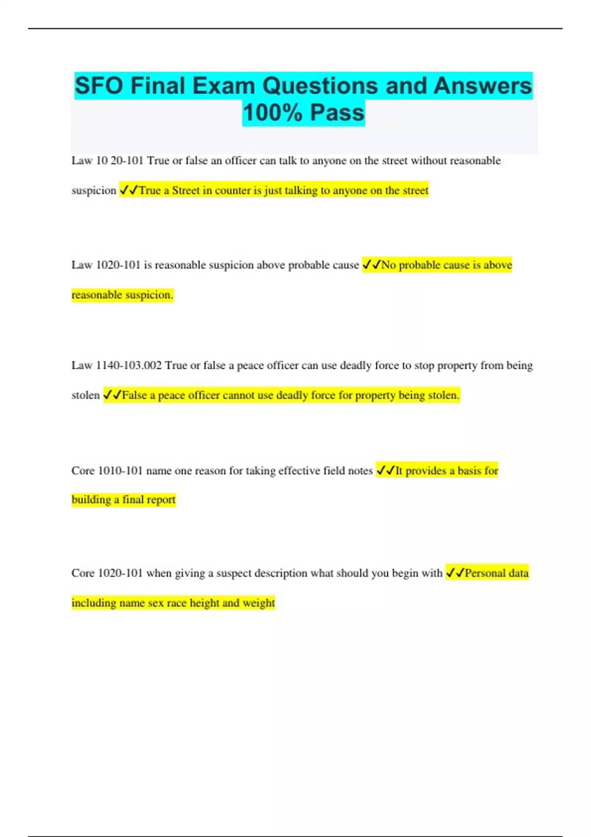 SFO Final Exam Questions and Answers 100% Pass Law 10 20-101 True or false an officer can talk to anyone on the street without reasonable suspicion True a Street in counter is just talking to anyone on the street Law 1020-101 is reasonable suspicion above probable cause No probable cause is above reasonable suspicion. Law 1140-103.002 True or false a peace officer can use deadly force to stop property from being stolen False a peace officer cannot use deadly force for property being stolen. Core 1010-101 name one reason for taking effective field notes It provides a basis for building a final report Core 1020-101 when giving a suspect description what should you begin with Personal data including name sex race height and weight ETH 1020-102.002 True or false an officer that has a low emotional intelligence can effectively/safely de-escalate a situation False an officer must be able to self regulate before he can effectively/safely de-escalate a situation Ethics 1020-101.003 What are the basic components of emotional intelligence Self- awareness, self regulation, empathy, motivation, social skills. ETH 1030-102.002 in which situation should you intervene on an officer. When leaving a subject cuffed in the prone position FND 1020-115.001 what is a potential consequence for evidence obtained in violation of constitutional rights Exclusionary rule ETH 1020-103.001 what affects an officers professionalism Professionalism requires high emotional intelligence. ETH 1030-103 what are the three D's of intervention Distract direct delegate What is the Utah Supreme Court known as The Utah court of last resort FND 1050-104.002 can a judge denied bail Yes a judge can deny bail INTX 1010-102.001 which of the following drugs is a depressant Thorazine INV 1010-107 What case law deals with the confessions or statements obtained through an illegal arrest not being allowed even though Miranda warning was given Brown versus Illinois 1975 I am V one 030-106 the first officer on a scene to a crime scene investigation should do what first Scene size up INV 1040-102 during an investigation all of the evidence was properly documented labeled and placed in the same package but will be unusable because of what Contamination INV 1050-110 case follow up procedures and information should be conveyed to a victim of a crime True case follow up procedures should