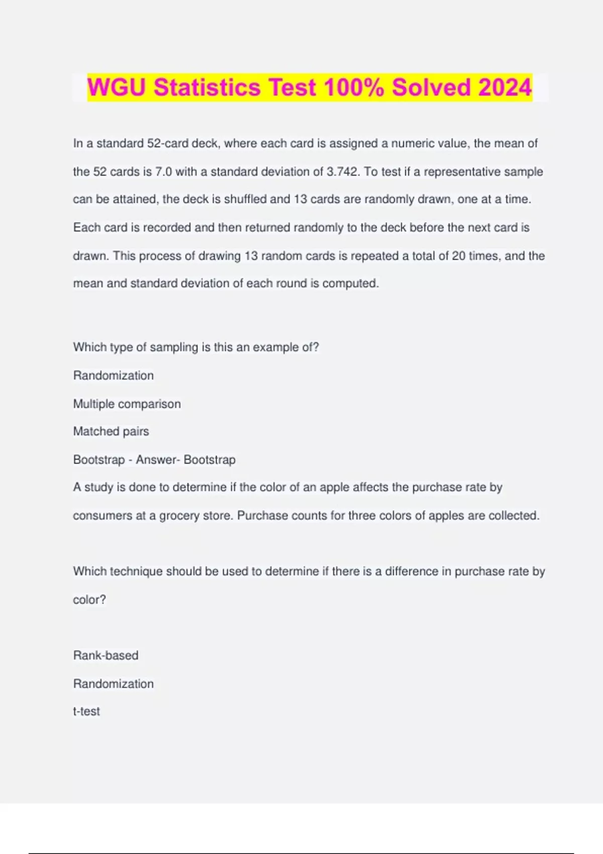 WGU Statistics Test 100% Solved 2024 In a standard 52-card deck, where each card is assigned a numeric value, the mean of the 52 cards is 7.0 with a standard deviation of 3.742. To test if a representative sample can be attained, the deck is shuffled and 13 cards are randomly drawn, one at a time. Each card is recorded and then returned randomly to the deck before the next card is drawn. This process of drawing 13 random cards is repeated a total of 20 times, and the mean and standard deviation of each round is computed. Which type of sampling is this an example of? Randomization Multiple comparison Matched pairs Bootstrap - Answer- Bootstrap A study is done to determine if the color of an apple affects the purchase rate by consumers at a grocery store. Purchase counts for three colors of apples are collected. Which technique should be used to determine if there is a difference in purchase rate by color? Rank-based Randomization t-test ANOVA - Answer- ANOVA A hospital network collects the amount of time it takes doctors to see patients. Which two techniques are appropriate to compare the mean times of two subsets within this set of doctors? Choose 2 answers ANOVA t-test Logistic regression Principal component analysis - Answer- ANOVA t-test A data analyst needs to determine whether antioxidants in blackberries can reduce age- related cognitive decline. Twenty-five adults between 65 and 80 are selected to eat blackberries for six months and be retested. The original scores are compared with the second scores to determine whether there was decline. What is the appropriate model to test the hypothesis? z test ANOVA Linear regression Two-sample t-test - Answer- Two-sample t-test Which assumption does a data analyst have to make when performing ANOVA on a dataset? There are just two parameters that are being estimated. The error terms follow a normal probability distribution. The parameters are additive. The explanatory variable is continuous. - Answer- The error terms follow a normal probability distribution. Which two assumptions are made when the linear regression model is used? Choose 2 answers Critical value is based on Fisher's exact test. Error terms are independent and identically distributed. Variances are not equal. Parameters β 0, β 1, and σ 2 are constant. - Answer- Error terms are independent and identically distributed. Parameters β 0, β 1, and σ 2 are constant. Which assumption is required to perform a two-sample t-test? Equal variance Large sample size Small sum of residuals Equal mean - Answer- Equal variance Given the following statistical model: y = 42 - 4.6 b Match each element of the model with its corresponding term. Answer options may be used more than once or not at all. Select your answers from the pull-down list. y Dependent variable Dependent variable 42 Intercept Intercept -4.6 Slope Slope b Independent variable Independent variable - Answer- y Dependent variable Dependent variable 42 Intercept Intercept -4.6 Slope Slope b Independent variable Independent variable