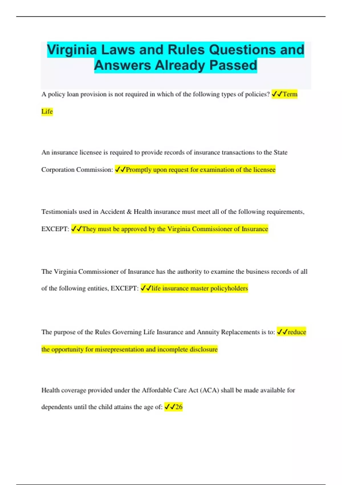 Virginia Laws and Rules Questions and Answers Already Passed A policy loan provision is not required in which of the following types of policies? Term Life An insurance licensee is required to provide records of insurance transactions to the State Corporation Commission: Promptly upon request for examination of the licensee Testimonials used in Accident & Health insurance must meet all of the following requirements, EXCEPT: They must be approved by the Virginia Commissioner of Insurance The Virginia Commissioner of Insurance has the authority to examine the business records of all of the following entities, EXCEPT: life insurance master policyholders The purpose of the Rules Governing Life Insurance and Annuity Replacements is to: reduce the opportunity for misrepresentation and incomplete disclosure Health coverage provided under the Affordable Care Act (ACA) shall be made available for dependents until the child attains the age of: 26 An insurance agent is in violation of the Rules Governing Advertisement of Life Insurance and Annuities if the agent takes which of the following actions during a sales presentation? Refers to guaranteed policy dividends The Commission may suspend or revoke the license of an agent who takes any of the following actions EXCEPT represents more than one insurance company When soliciting a Medicare Supplement policy, an insurance agent should advise an applicant that the: agent is there to determine what, if any, policy is appropriate for the purchaser, considering existing coverage The act of offering an applicant something of value as an inducement to purchase a policy of insurance is: rebating Medicare supplement insurance is issued by insurance companies An advertisement stating that an agent is licensed for a line of authority, when that agent is not licensed for that line of authority, is: false advertising An agent must maintain records of insurance transactions for a MINIMUM of how many previous calendar years? 3 At the date of issue, an employee group life insurance policy must cover a MINIMUM of how many employees? 2 Which of the following statements about a business entity acting as an insurance agent is CORRECT? It must designate at least 1 licensed producer to be responsible for the entity's compliance with the insurance laws and rules Which of the following statements is a purpose of the Rules Governing Advertisement of Life Insurance and Annuities? To assure full disclosure to the public of all material and relevant information A Long Term Care insurance contract shall provide coverage for a minimum of how many months? 12 The State Corporation Commission has the authority