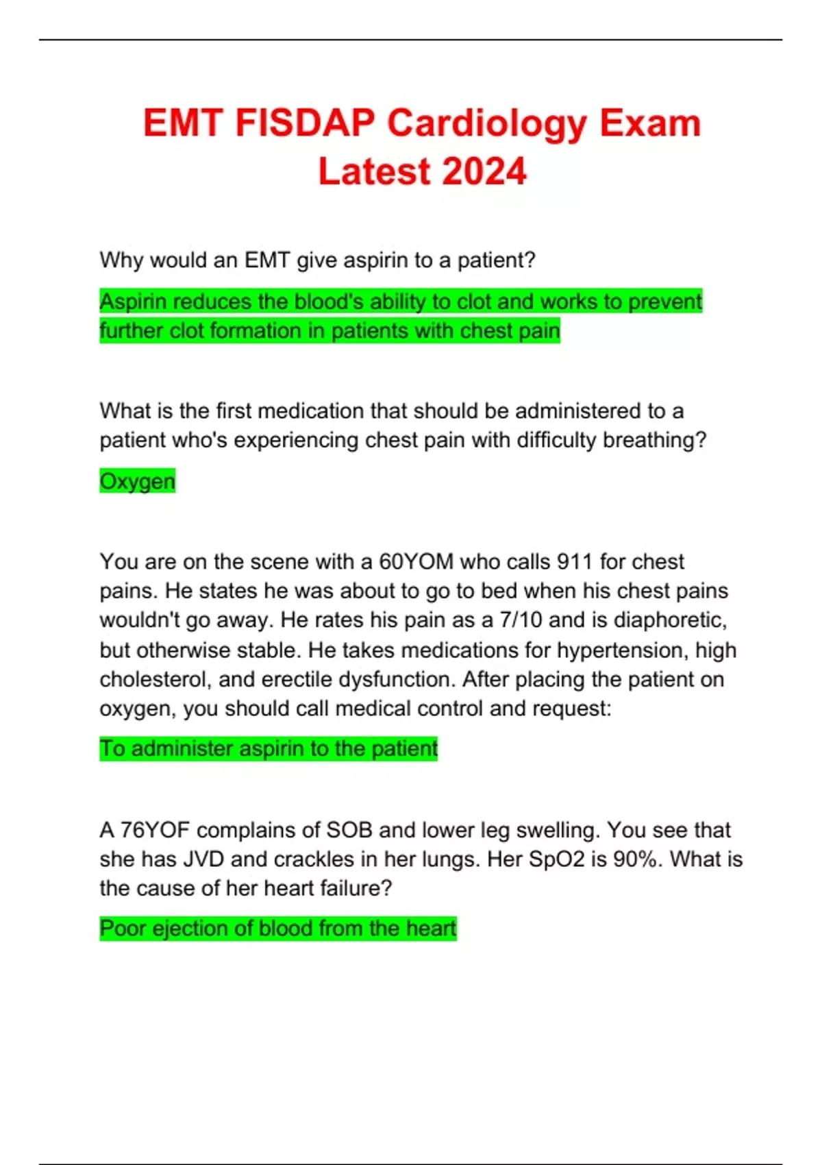 EMT FISDAP Cardiology Exam | Questions and Verified Answers Latest 2024