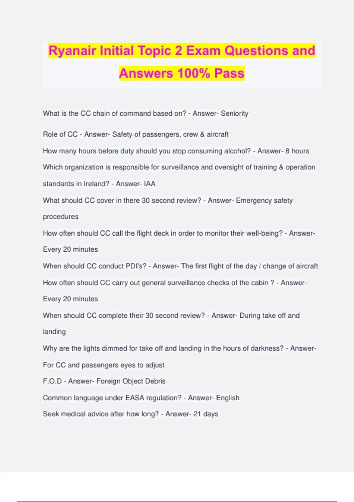Ryanair Initial Topic 2 Exam Questions and Answers 100% Pass What is the CC chain of command based on? - Answer- Seniority Role of CC - Answer- Safety of passengers, crew & aircraft How many hours before duty should you stop consuming alcohol? - Answer- 8 hours Which organization is responsible for surveillance and oversight of training & operation standards in Ireland? - Answer- IAA What should CC cover in there 30 second review? - Answer- Emergency safety procedures How often should CC call the flight deck in order to monitor their well-being? - Answer- Every 20 minutes When should CC conduct PDI's? - Answer- The first flight of the day / change of aircraft How often should CC carry out general surveillance checks of the cabin ? - Answer- Every 20 minutes When should CC complete their 30 second review? - Answer- During take off and landing Why are the lights dimmed for take off and landing in the hours of darkness? - Answer- For CC and passengers eyes to adjust F.O.D - Answer- Foreign Object Debris Common language under EASA regulation? - Answer- English Seek medical advice after how long? - Answer- 21 days