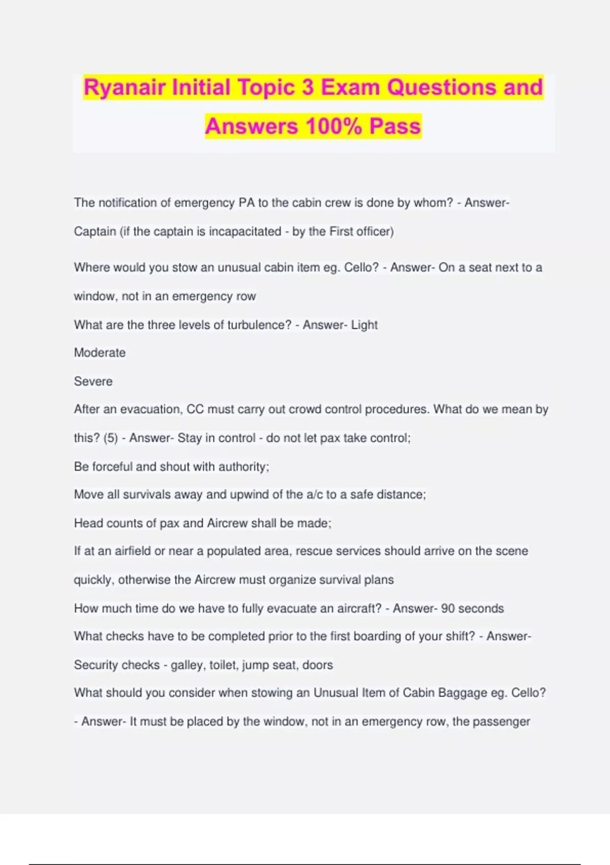 Ryanair Initial Topic 3 Exam Questions and Answers 100% Pass The notification of emergency PA to the cabin crew is done by whom? - Answer- Captain (if the captain is incapacitated - by the First officer) Where would you stow an unusual cabin item eg. Cello? - Answer- On a seat next to a window, not in an emergency row What are the three levels of turbulence? - Answer- Light Moderate Severe After an evacuation, CC must carry out crowd control procedures. What do we mean by this? (5) - Answer- Stay in control - do not let pax take control; Be forceful and shout with authority; Move all survivals away and upwind of the a/c to a safe distance; Head counts of pax and Aircrew shall be made; If at an airfield or near a populated area, rescue services should arrive on the scene quickly, otherwise the Aircrew must organize survival plans How much time do we have to fully evacuate an aircraft? - Answer- 90 seconds What checks have to be completed prior to the first boarding of your shift? - Answer- Security checks - galley, toilet, jump seat, doors What should you consider when stowing an Unusual Item of Cabin Baggage eg. Cello? - Answer- It must be placed by the window, not in an emergency row, the passenger