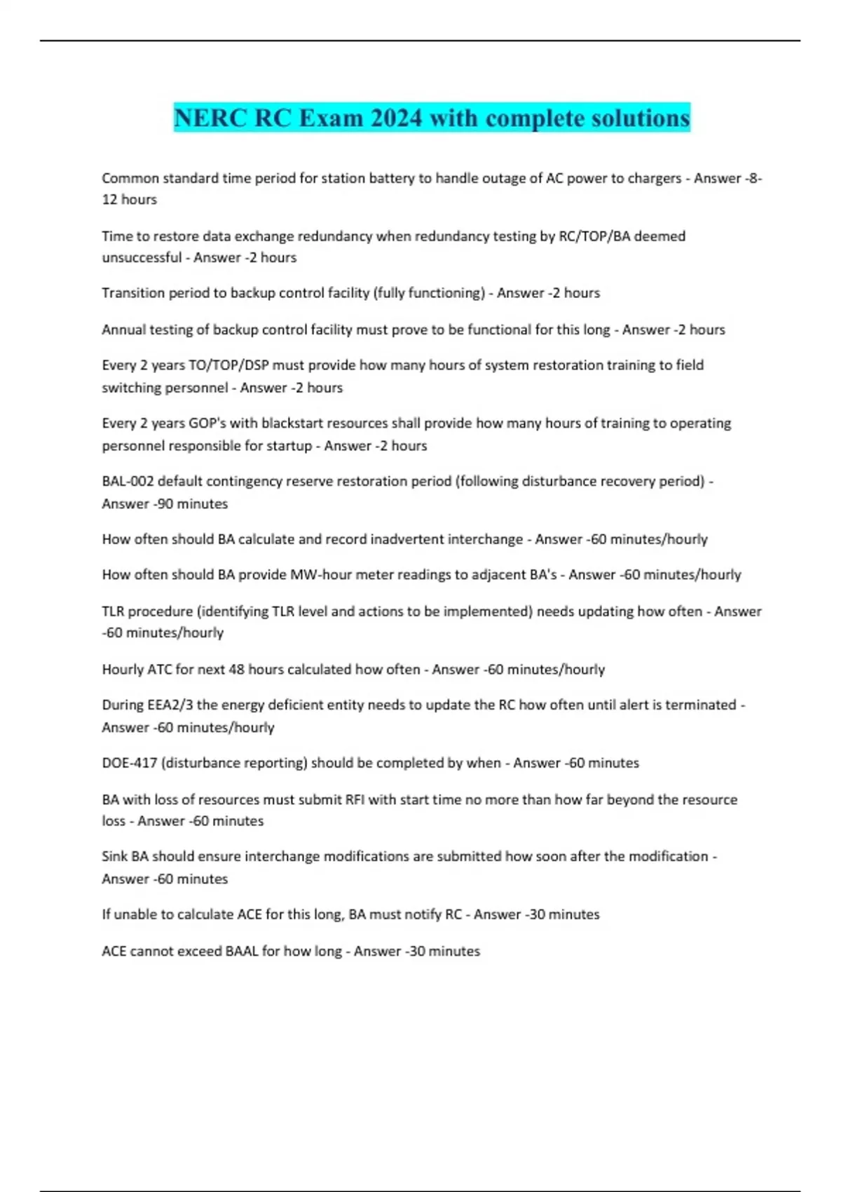 NERC RC Exam 2024 with complete solutions Common standard time period for station battery to handle outage of AC power to chargers - Answer -8- 12 hours Time to restore data exchange redundancy when redundancy testing by RC/TOP/BA deemed unsuccessful - Answer -2 hours Transition period to backup control facility (fully functioning) - Answer -2 hours Annual testing of backup control facility must prove to be functional for this long - Answer -2 hours Every 2 years TO/TOP/DSP must provide how many hours of system restoration training to field switching personnel - Answer -2 hours Every 2 years GOP's with blackstart resources shall provide how many hours of training to operating personnel responsible for startup - Answer -2 hours BAL-002 default contingency reserve restoration period (following disturbance recovery period) - Answer -90 minutes How often should BA calculate and record inadvertent interchange - Answer -60 minutes/hourly How often should BA provide MW-hour meter readings to adjacent BA's - Answer -60 minutes/hourly TLR procedure (identifying TLR level and actions to be implemented) needs updating how often - Answer -60 minutes/hourly Hourly ATC for next 48 hours calculated how often - Answer -60 minutes/hourly During EEA2/3 the energy deficient entity needs to update the RC how often until alert is terminated - Answer -60 minutes/hourly DOE-417 (disturbance reporting) should be completed by when - Answer -60 minutes BA with loss of resources must submit RFI with start time no more than how far beyond the resource loss - Answer -60 minutes Sink BA should ensure interchange modifications are submitted how soon after the modification - Answer -60 minutes If unable to calculate ACE for this long, BA must notify RC - Answer -30 minutes ACE cannot exceed BAAL for how long - Answer -30 minutes