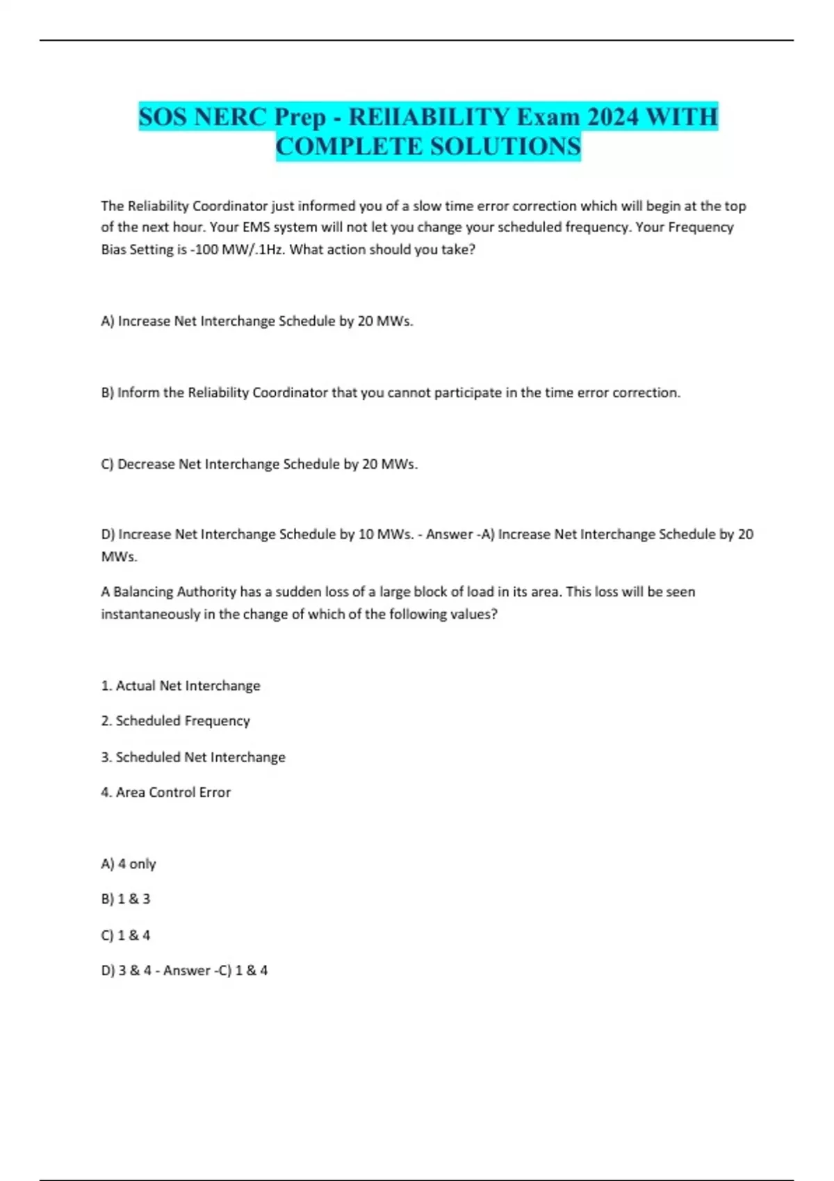 SOS NERC Prep - RElIABILITY Exam 2024 WITH COMPLETE SOLUTIONS The Reliability Coordinator just informed you of a slow time error correction which will begin at the top of the next hour. Your EMS system will not let you change your scheduled frequency. Your Frequency Bias Setting is -100 MW/.1Hz. What action should you take? A) Increase Net Interchange Schedule by 20 MWs. B) Inform the Reliability Coordinator that you cannot participate in the time error correction. C) Decrease Net Interchange Schedule by 20 MWs. D) Increase Net Interchange Schedule by 10 MWs. - Answer -A) Increase Net Interchange Schedule by 20 MWs. A Balancing Authority has a sudden loss of a large block of load in its area. This loss will be seen instantaneously in the change of which of the following values? 1. Actual Net Interchange 2. Scheduled Frequency 3. Scheduled Net Interchange 4. Area Control Error A) 4 only B) 1 & 3 C) 1 & 4 D) 3 & 4 - Answer -C) 1 & 4