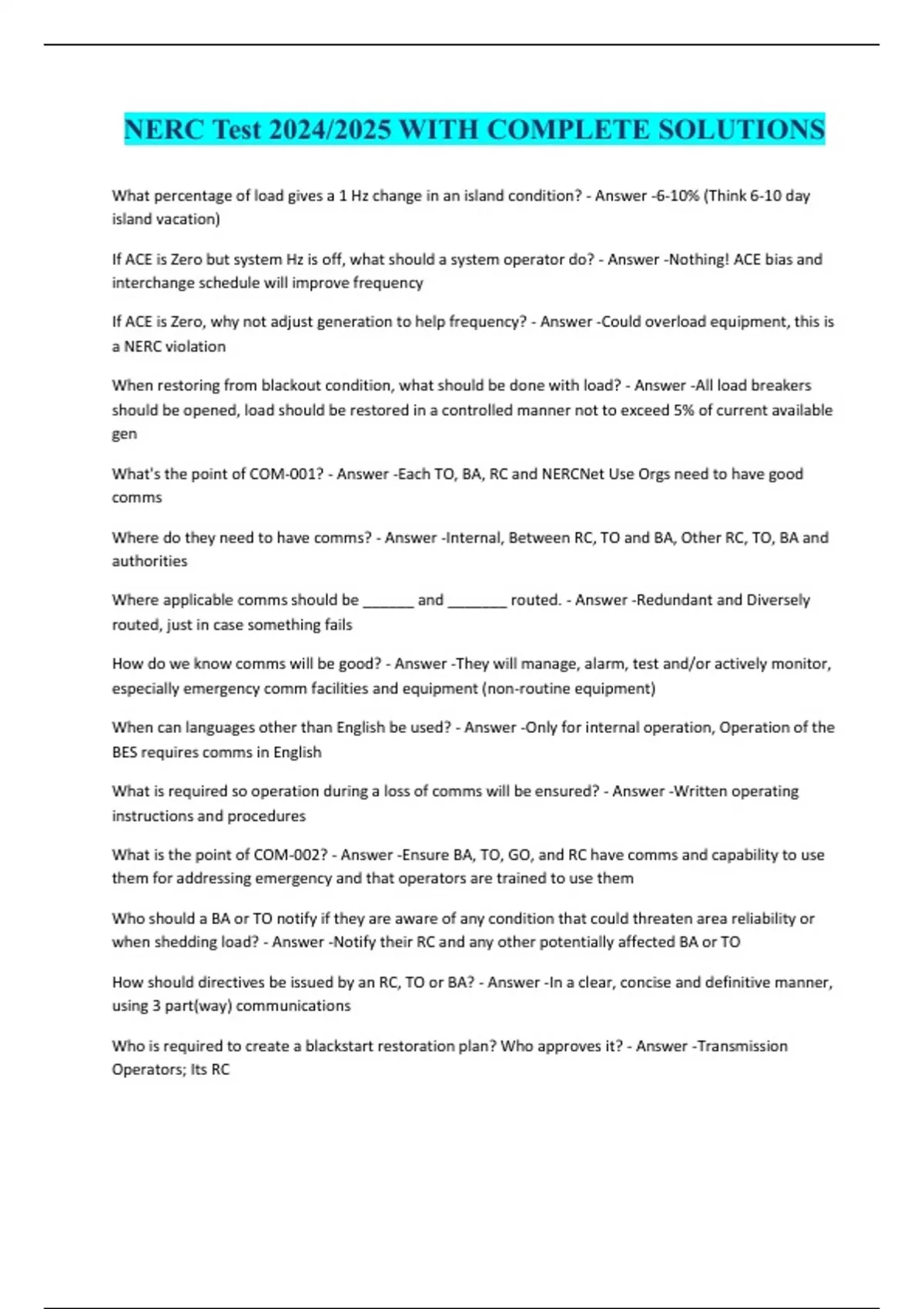 NERC Test 2024/2025 WITH COMPLETE SOLUTIONS What percentage of load gives a 1 Hz change in an island condition? - Answer -6-10% (Think 6-10 day island vacation) If ACE is Zero but system Hz is off, what should a system operator do? - Answer -Nothing! ACE bias and interchange schedule will improve frequency If ACE is Zero, why not adjust generation to help frequency? - Answer -Could overload equipment, this is a NERC violation When restoring from blackout condition, what should be done with load? - Answer -All load breakers should be opened, load should be restored in a controlled manner not to exceed 5% of current available gen What's the point of COM-001? - Answer -Each TO, BA, RC and NERCNet Use Orgs need to have good comms Where do they need to have comms? - Answer -Internal, Between RC, TO and BA, Other RC, TO, BA and authorities Where applicable comms should be ______ and _______ routed. - Answer -Redundant and Diversely routed, just in case something fails How do we know comms will be good? - Answer -They will manage, alarm, test and/or actively monitor, especially emergency comm facilities and equipment (non-routine equipment) When can languages other than English be used? - Answer -Only for internal operation, Operation of the BES requires comms in English What is required so operation during a loss of comms will be ensured? - Answer -Written operating instructions and procedures What is the point of COM-002? - Answer -Ensure BA, TO, GO, and RC have comms and capability to use them for addressing emergency and that operators are trained to use them Who should a BA or TO notify if they are aware of any condition that could threaten area reliability or when shedding load? - Answer -Notify their RC and any other potentially affected BA or TO How should directives be issued by an RC, TO or BA? - Answer -In a clear, concise and definitive manner, using 3 part(way) communications Who is required to create a blackstart restoration plan? Who approves it? - Answer -Transmission Operators; Its RC