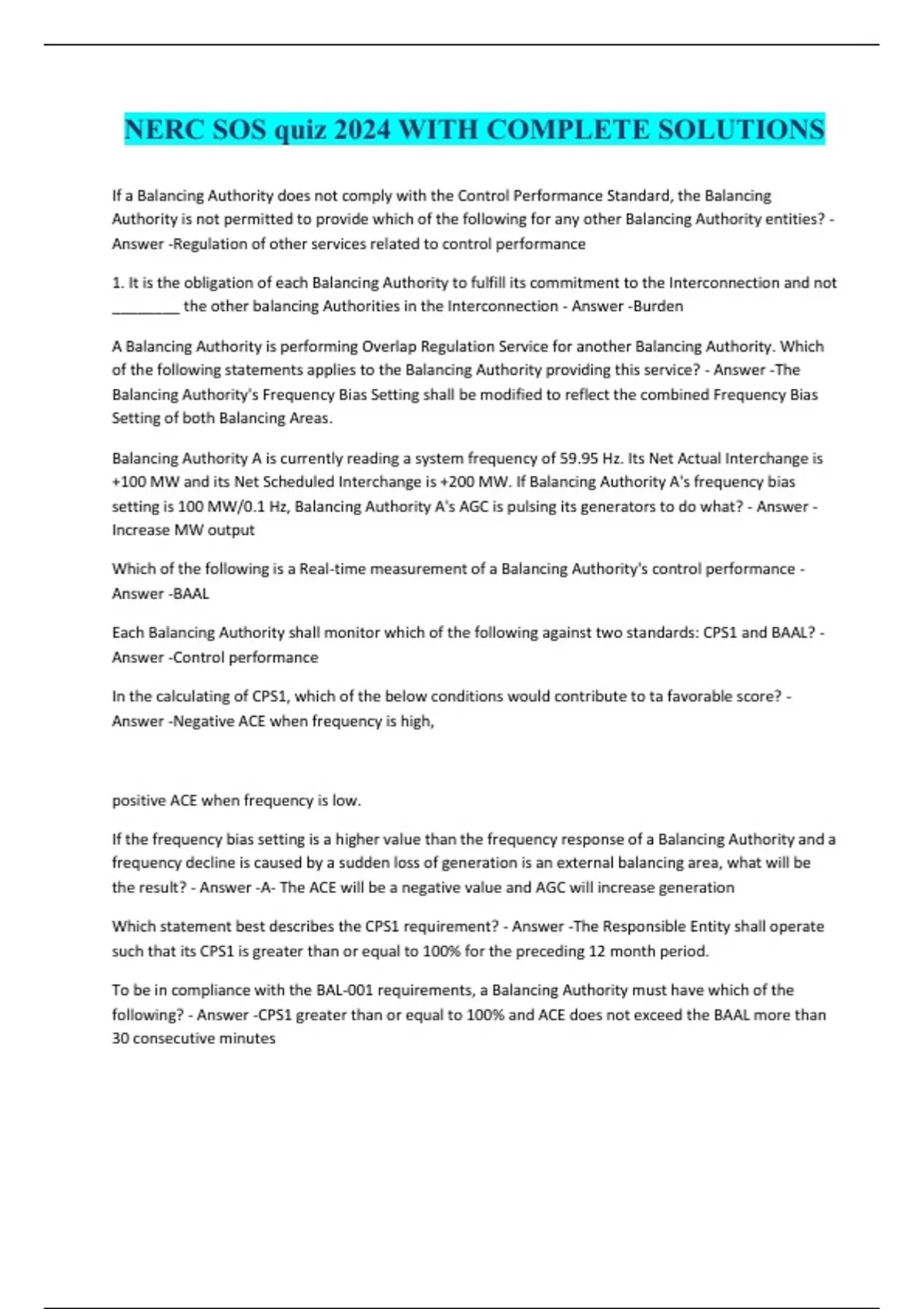 NERC SOS quiz 2024 WITH COMPLETE SOLUTIONS If a Balancing Authority does not comply with the Control Performance Standard, the Balancing Authority is not permitted to provide which of the following for any other Balancing Authority entities? - Answer -Regulation of other services related to control performance 1. It is the obligation of each Balancing Authority to fulfill its commitment to the Interconnection and not ________ the other balancing Authorities in the Interconnection - Answer -Burden A Balancing Authority is performing Overlap Regulation Service for another Balancing Authority. Which of the following statements applies to the Balancing Authority providing this service? - Answer -The Balancing Authority's Frequency Bias Setting shall be modified to reflect the combined Frequency Bias Setting of both Balancing Areas. Balancing Authority A is currently reading a system frequency of 59.95 Hz. Its Net Actual Interchange is +100 MW and its Net Scheduled Interchange is +200 MW. If Balancing Authority A's frequency bias setting is 100 MW/0.1 Hz, Balancing Authority A's AGC is pulsing its generators to do what? - Answer - Increase MW output Which of the following is a Real-time measurement of a Balancing Authority's control performance - Answer -BAAL Each Balancing Authority shall monitor which of the following against two standards: CPS1 and BAAL? - Answer -Control performance In the calculating of CPS1, which of the below conditions would contribute to ta favorable score? - Answer -Negative ACE when frequency is high, positive ACE when frequency is low. If the frequency bias setting is a higher value than the frequency response of a Balancing Authority and a frequency decline is caused by a sudden loss of generation is an external balancing area, what will be the result? - Answer -A- The ACE will be a negative value and AGC will increase generation Which statement best describes the CPS1 requirement? - Answer -The Responsible Entity shall operate such that its CPS1 is greater than or equal to 100% for the preceding 12 month period. To be in compliance with the BAL-001 requirements, a Balancing Authority must have which of the following? - Answer -CPS1 greater than or