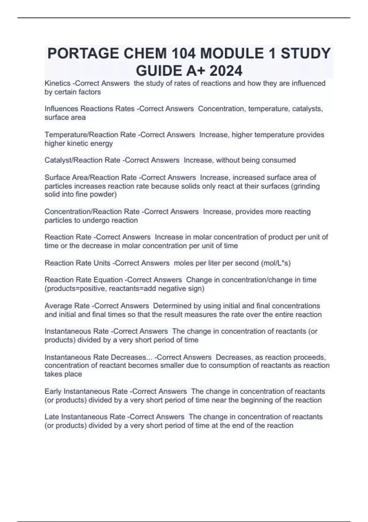 Kinetics -Correct Answers the study of rates of reactions and how they are influenced by certain factors Influences Reactions Rates -Correct Answers Concentration, temperature, catalysts, surface area Temperature/Reaction Rate -Correct Answers Increase, higher temperature provides higher kinetic energy Catalyst/Reaction Rate -Correct Answers Increase, without being consumed Surface Area/Reaction Rate -Correct Answers Increase, increased surface area of particles increases reaction rate because solids only react at their surfaces (grinding solid into fine powder) Concentration/Reaction Rate -Correct Answers Increase, provides more reacting particles to undergo reaction Reaction Rate -Correct Answers Increase in molar concentration of product per unit of time or the decrease in molar concentration per unit of time Reaction Rate Units -Correct Answers moles per liter per second (mol/L*s) Reaction Rate Equation -Correct Answers Change in concentration/change in time (products=positive, reactants=add negative sign) Average Rate -Correct Answers Determined by using initial and final concentrations and initial and final times so that the result measures the rate over the entire reaction Instantaneous Rate -Correct Answers The change in concentration of reactants (or products) divided by a very short period of time Instantaneous Rate Decreases... -Correct Answers Decreases, as reaction proceeds, concentration of reactant becomes smaller due to consumption of reactants as reaction takes place Early Instantaneous Rate -Correct Answers The change in concentration of reactants (or products) divided by a very short period of time near the beginning of the reaction Late Instantaneous Rate -Correct Answers The change in concentration of reactants (or products) divided by a very short period of time at the end of the reaction