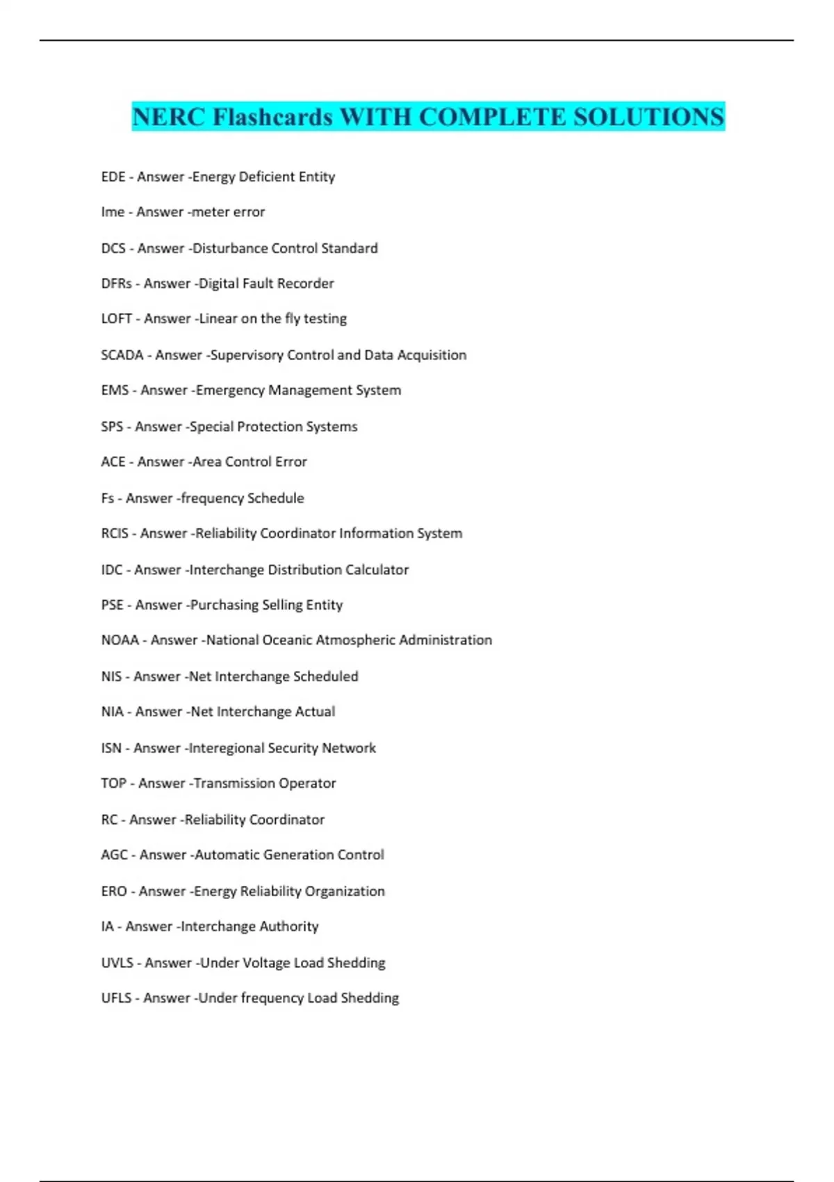 NERC Flashcards WITH COMPLETE SOLUTIONS EDE - Answer -Energy Deficient Entity Ime - Answer -meter error DCS - Answer -Disturbance Control Standard DFRs - Answer -Digital Fault Recorder LOFT - Answer -Linear on the fly testing SCADA - Answer -Supervisory Control and Data Acquisition EMS - Answer -Emergency Management System SPS - Answer -Special Protection Systems ACE - Answer -Area Control Error Fs - Answer -frequency Schedule RCIS - Answer -Reliability Coordinator Information System IDC - Answer -Interchange Distribution Calculator PSE - Answer -Purchasing Selling Entity NOAA - Answer -National Oceanic Atmospheric Administration NIS - Answer -Net Interchange Scheduled NIA - Answer -Net Interchange Actual ISN - Answer -Interegional Security Network TOP - Answer -Transmission Operator RC - Answer -Reliability Coordinator