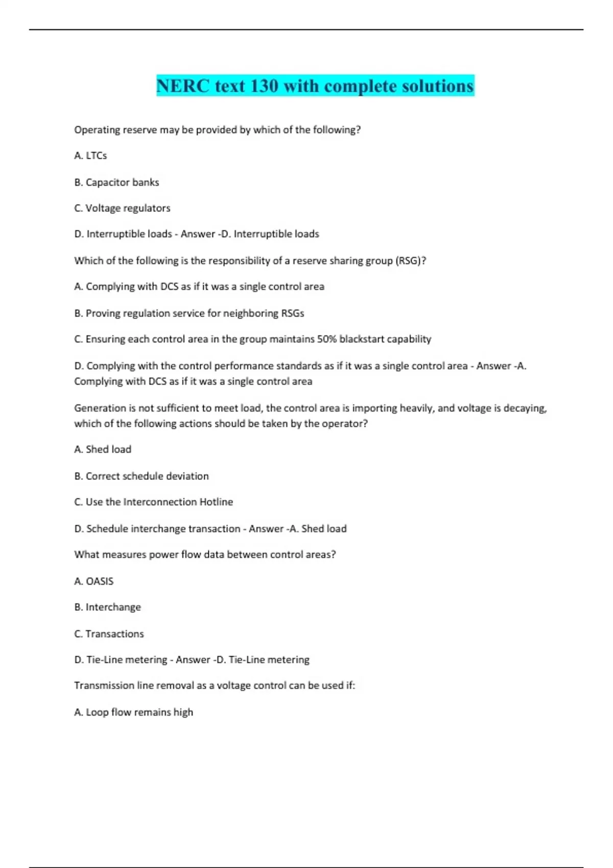 NERC text 130 with complete solutions Operating reserve may be provided by which of the following? A. LTCs B. Capacitor banks C. Voltage regulators D. Interruptible loads - Answer -D. Interruptible loads Which of the following is the responsibility of a reserve sharing group (RSG)? A. Complying with DCS as if it was a single control area B. Proving regulation service for neighboring RSGs C. Ensuring each control area in the group maintains 50% blackstart capability D. Complying with the control performance standards as if it was a single control area - Answer -A. Complying with DCS as if it was a single control area Generation is not sufficient to meet load, the control area is importing heavily, and voltage is decaying, which of the following actions should be taken by the operator? A. Shed load B. Correct schedule deviation C. Use the Interconnection Hotline D. Schedule interchange transaction - Answer -A. Shed load What measures power flow data between control areas? A. OASIS B. Interchange C. Transactions D. Tie-Line metering - Answer -D. Tie-Line metering Transmission line removal as a voltage control can be used if: A. Loop flow remains high